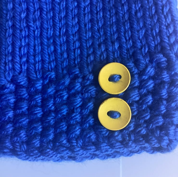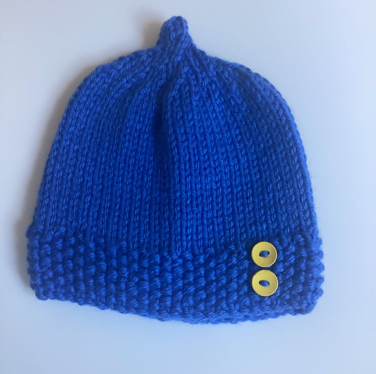 Cute little pixie style hat designed and hand knit by me in my Suffolk home. I’ve used a wonderfully soft merino and acrylic mix chunky yarn to make this lovely warm hat that is decorated with two yellow coloured wooden buttons. To fit a little one from 3 to 12 month approximately and would make a welcome gift too.