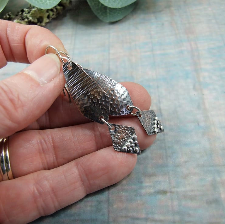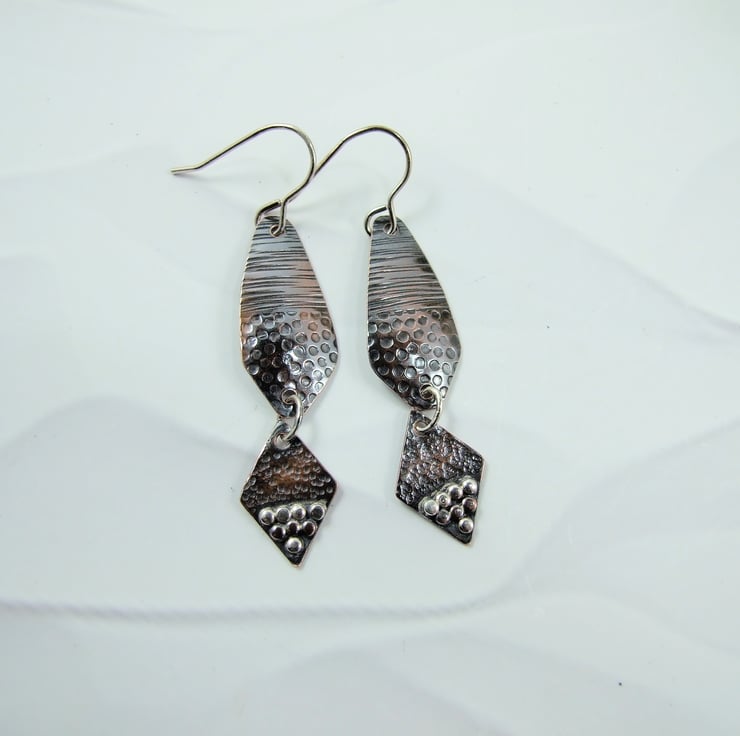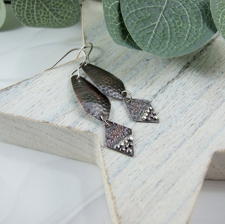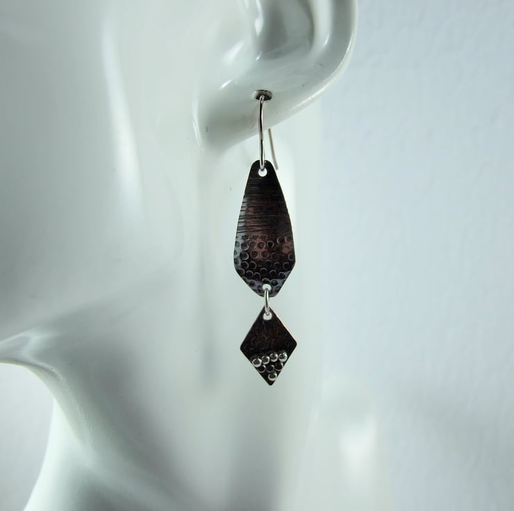 I have created the earrings using copper sheet, the top part has been cut into a long diamond shape and given two different texture patterns. The smaller diamond at the bottom has also been cut from copper sheet and textured with a different hammer, then I added lots of little coper and silver beads for contrast. Fitted to sterling silver ear hooks