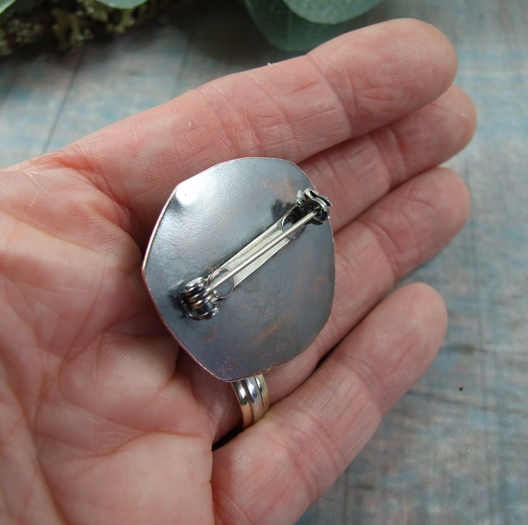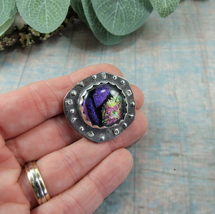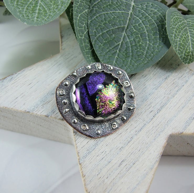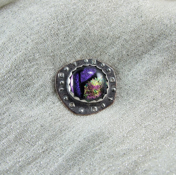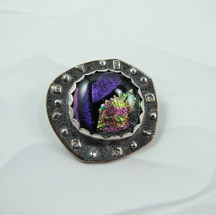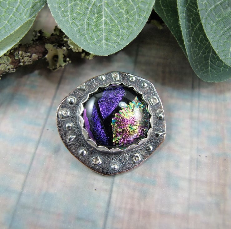 I began by making the dichroic glass cabachon. Cutting and layering shards of glass then kiln firing. Once heated to melting point the glass fuses together to create a natural domed organic shape, this process can take up to 8 hours. Once the glass was ready I made the setting using copper sheet, wire and a few white metal accents for contrast and gave the brooch an antiqued finish. Brooch back is a pin with safety closure.
