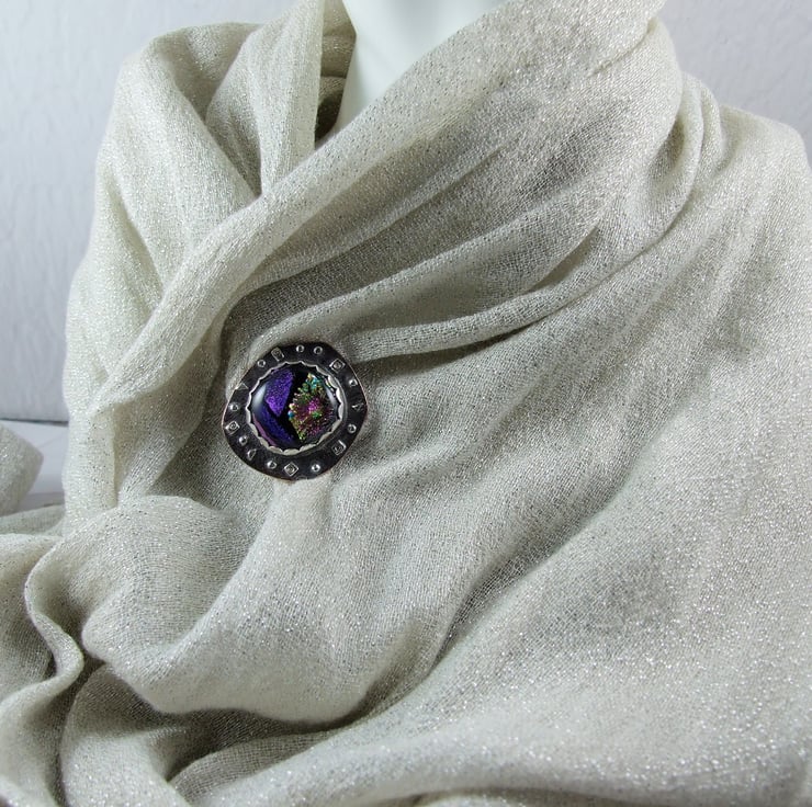 Handcrafted copper and colourful dichroic glass brooch. Could also be worn as a lighter shawl pin.