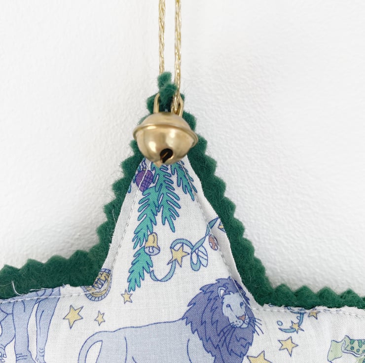 A Christmas star in the gorgeous Liberty of London ‘At The Zoo’ fabric. Each star can be filled with lavender or soft polyester stuffing and comes with a glittery gold hanging loop and a decorative jingle bell.