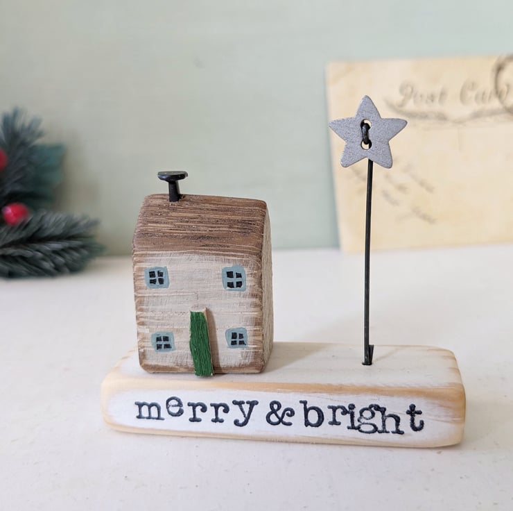 A teeny festive wooden house scene in a bag, that you can personalise with your own decoration!