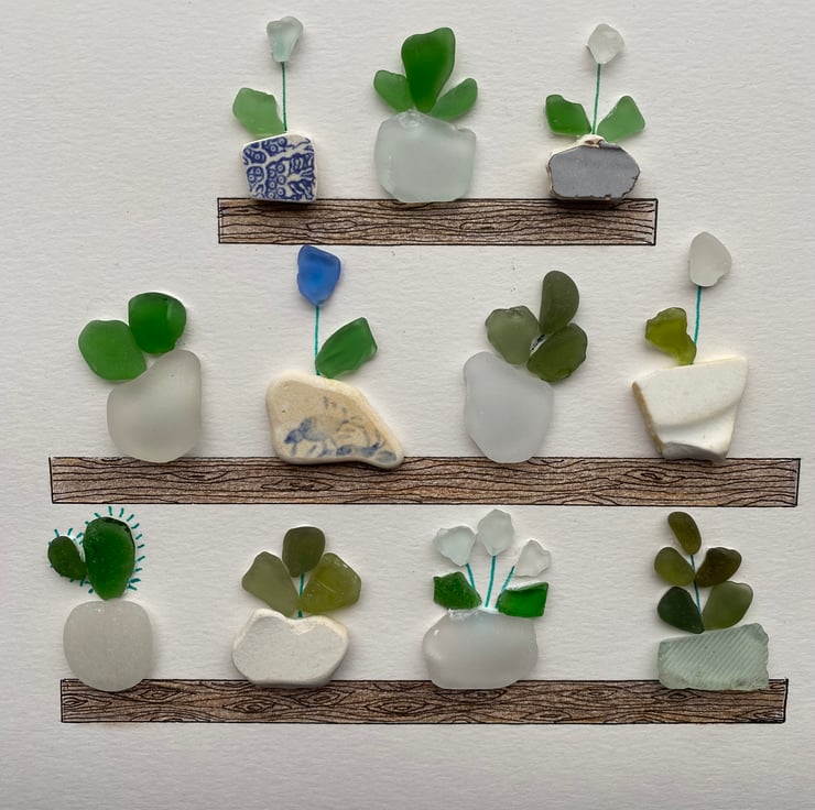 A pretty plant pot design made with some lovely pieces of sea glass and sea pottery. The blue and White Sea pottery on the top shelf was found on St Ives harbour beach. The sea pottery with a bird on it, second shelf, was found on Polperro beach.