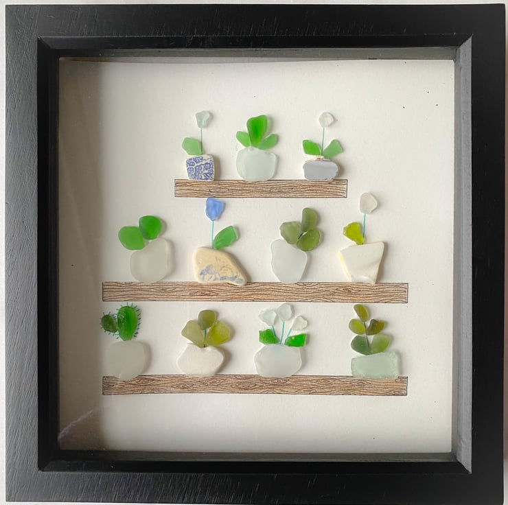 SALE Framed plant pot art made with Cornwall sea glass and pottery