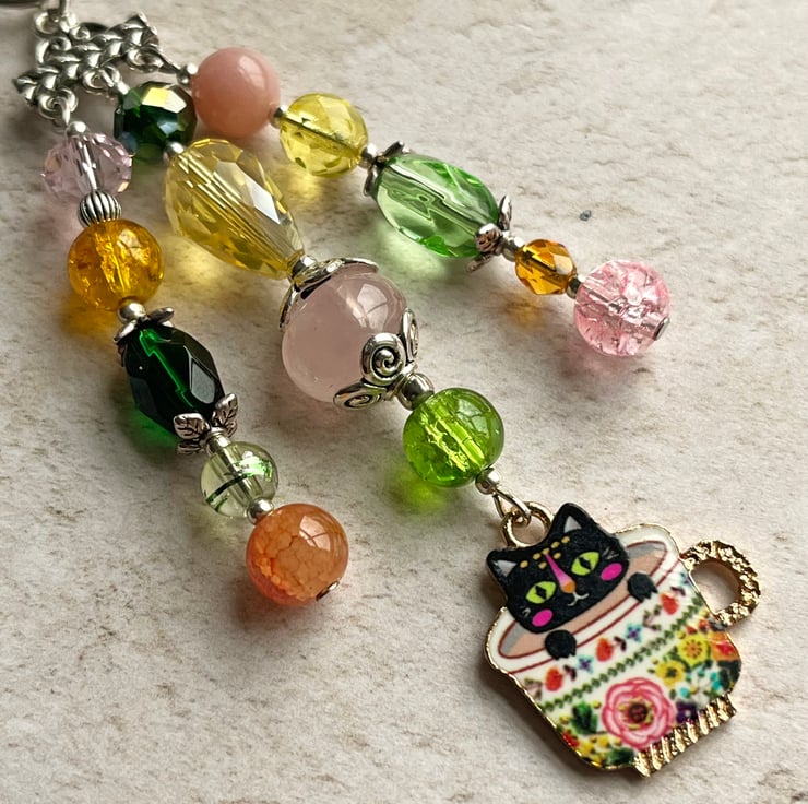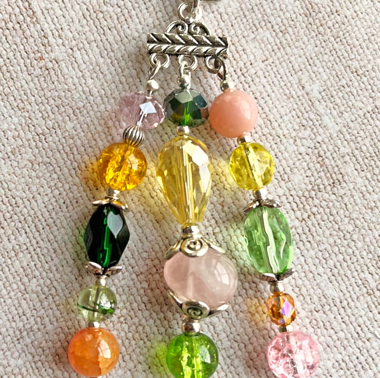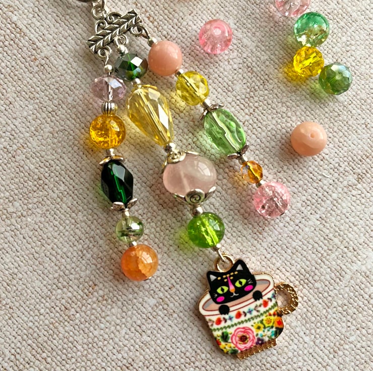 I've used a cute enamel charm and an assortment of glass and semi-precious beads including Rose Quartz, pink opal, drawbench and crackle glass.