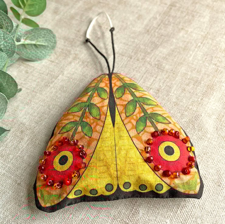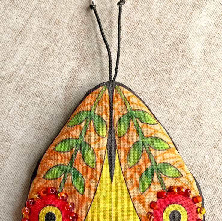 The lavender bag moth is my own design which has been printed onto cotton fabric. I've embellished its wings with orange and red seed beads and incorporated the antennae into the hanging loop. The back of the bag is plain black.