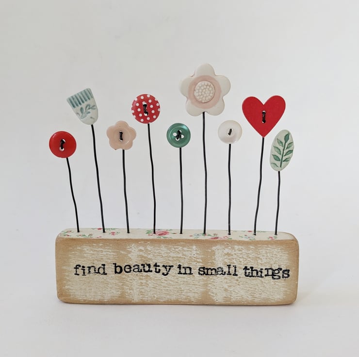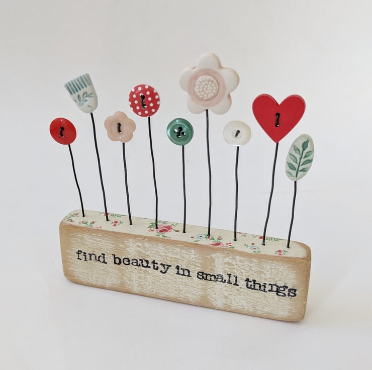 Button flowers grow in a row in this little garden with a clay leaf and flowers. They stand on their wire stalks in a wooden block with a decoupaged floral top.