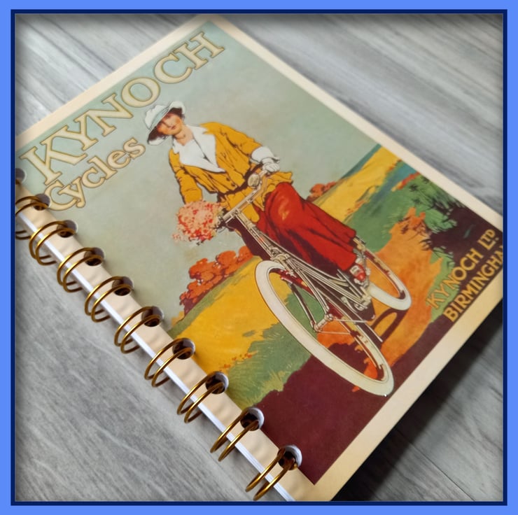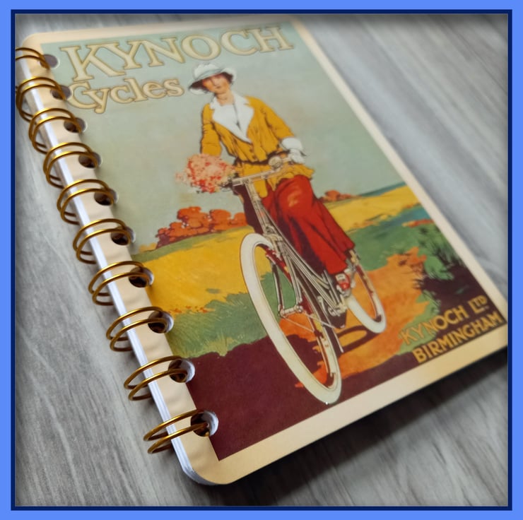 This wire bound Notebook has a front cover made from reproduction Postcard Kynoch Cycles advert. There are 20 pages (40 sides) white paper, which have been sprial bound with Gold wire, the back cover is brown card. The over all size is 10cm wide by 14cm high, ideal size to pop in a coat pocket or bag, ready for you jot down notes or sketch. Great gift for a cyclists lover, good size to pop into a Christmas Stocking