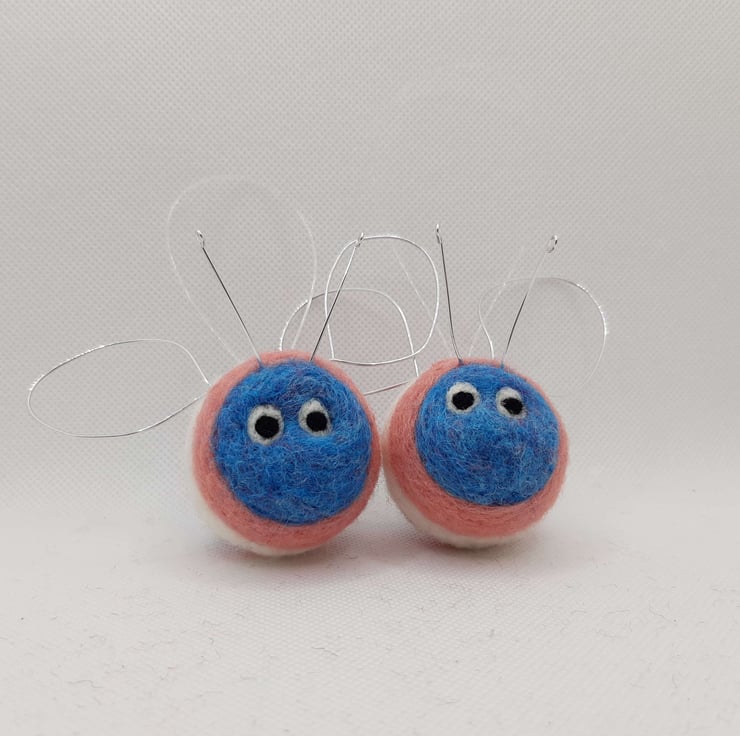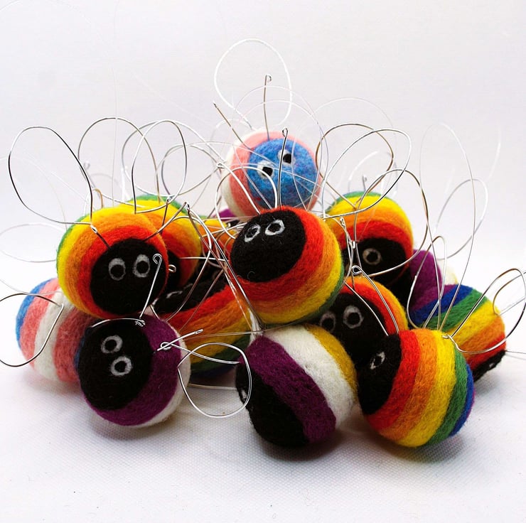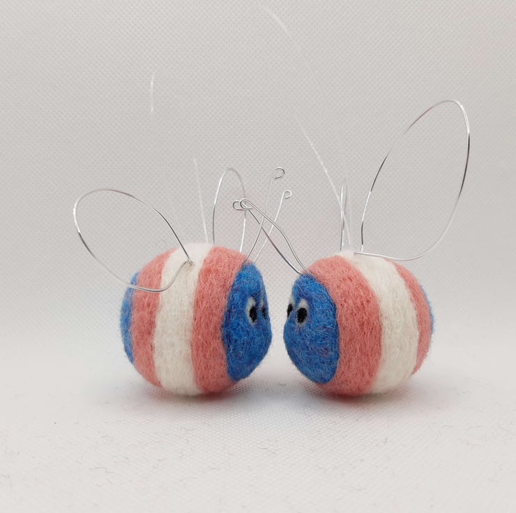 Needle felted from Corriedale wool with wire wings and antennae and a transparent thread hanging loop. Due to the handmade nature of these items, TransBees vary slightly in size, but the body measures approximately 5cm diameter.
