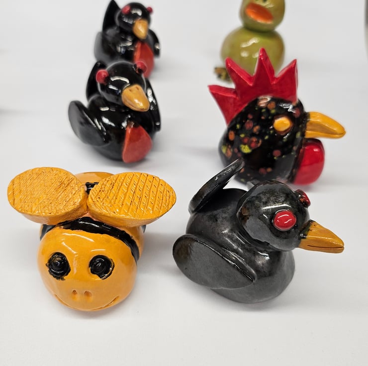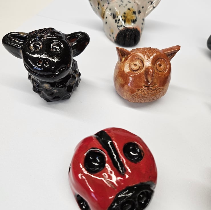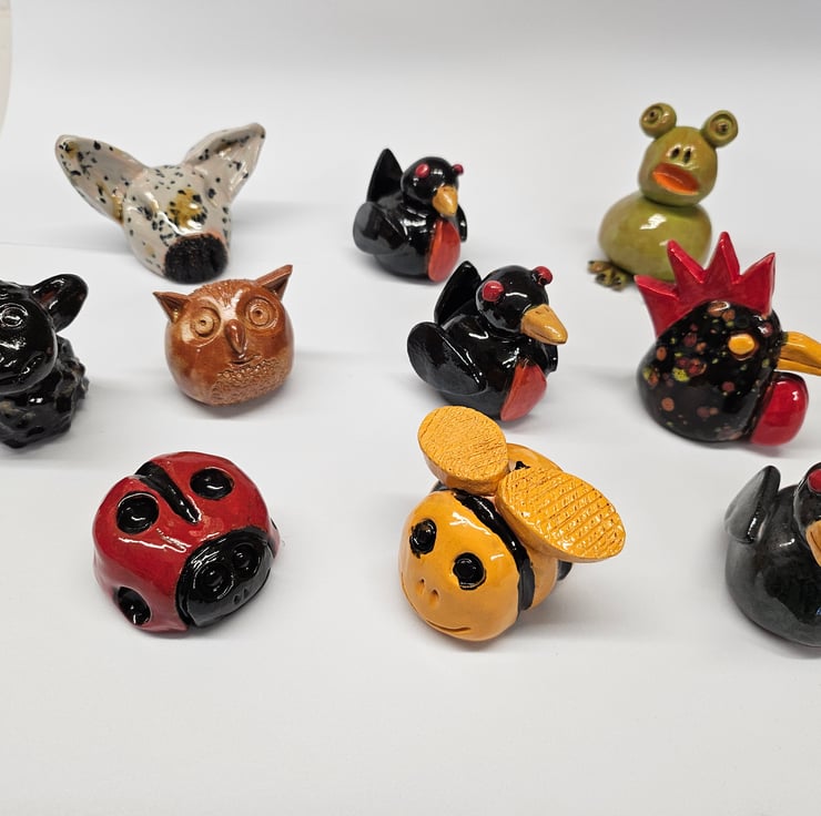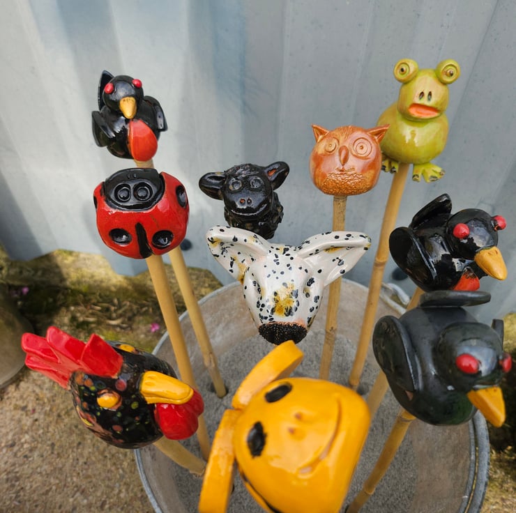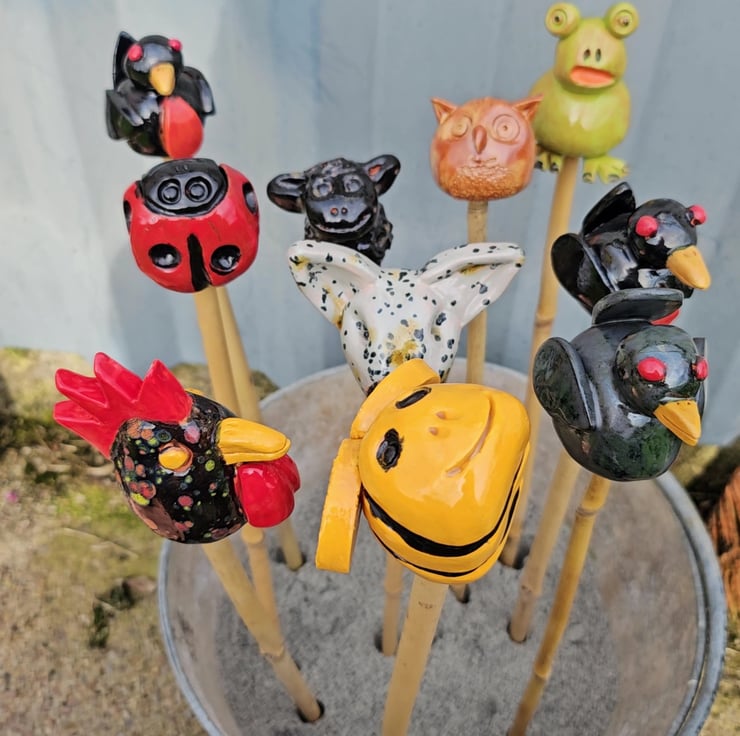 Cane Tops for your garden. Made from red earthenware clay, all glazed to suit the subject! Last for years and years in all weathers in your garden. This animal collection consists of English Bull Terrier, Black Sheep, Brown Owl, 2 Robins, Green Frog, Black Speckled Chicken, Blackbird, Lady Bird and a Bumble Bee. I use a variety of different bamboo canes to give a variety of hole sizes to fit bamboo canes.
