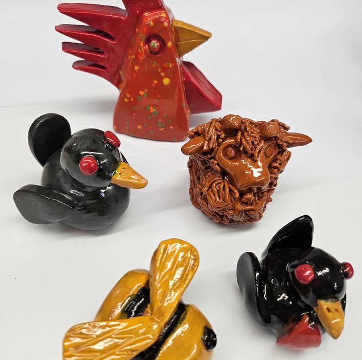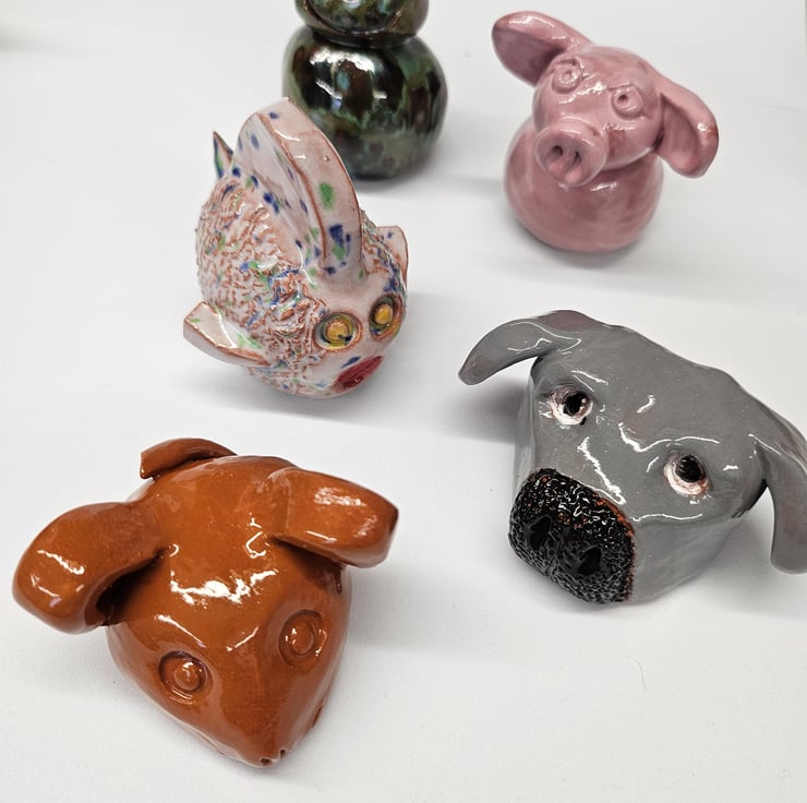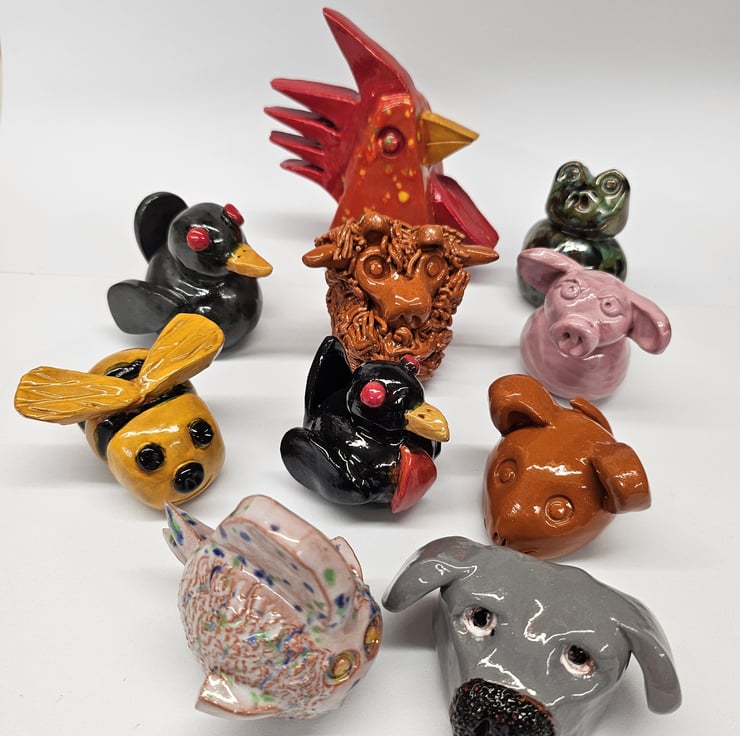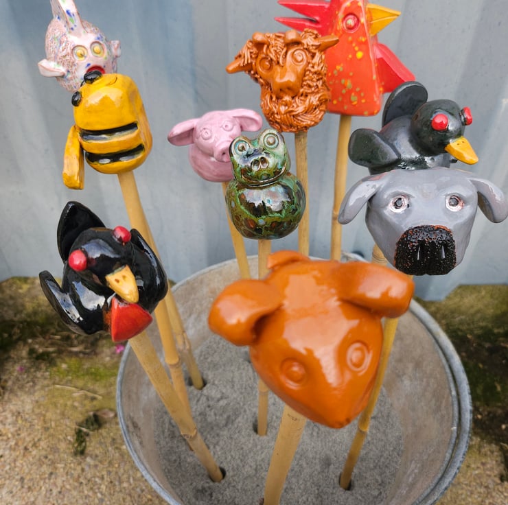 Cane Tops for your garden. Made from red earthenware clay, all glazed to suit the subject! Last for years and years in all weathers in your garden. This Animal Collection consists of a Red Speckled Chicken, Blackbird, Robin, Bumble Bee, White Fish, Grey Dog, Brown Mouse, Pink Pig, Green Frog, Red/Brown Angus Highland Cow . I use a variety of different bamboo canes to give a variety of hole sizes to fit bamboo canes.