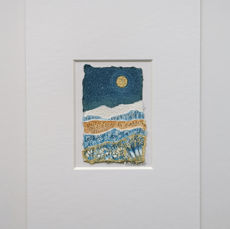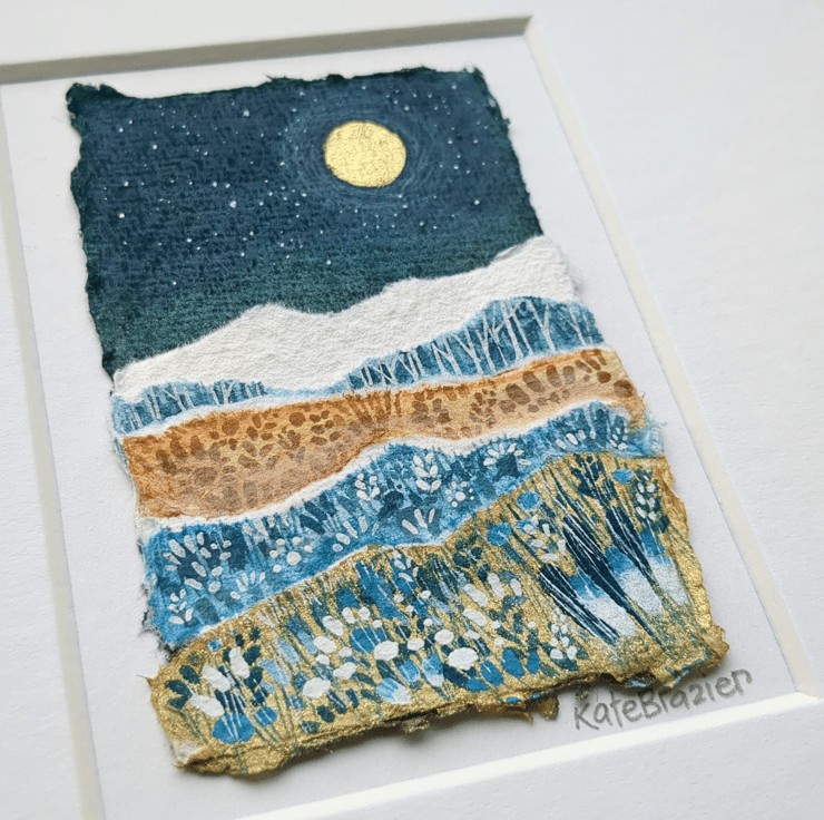 'Golden Fields' is a tiny, mixed media collage float mounted into a custom A5 mount. It has been finished with gold details.