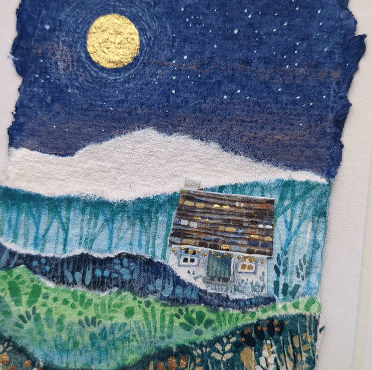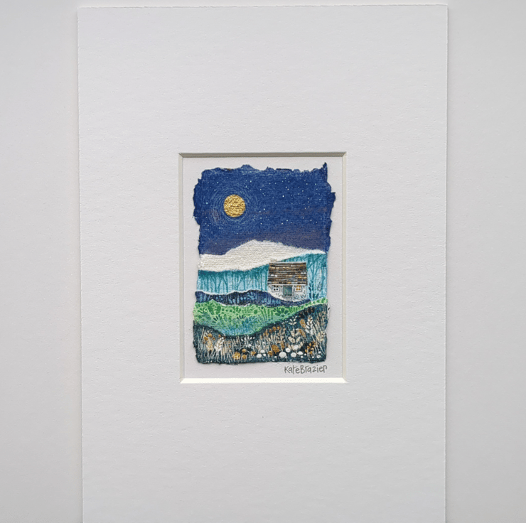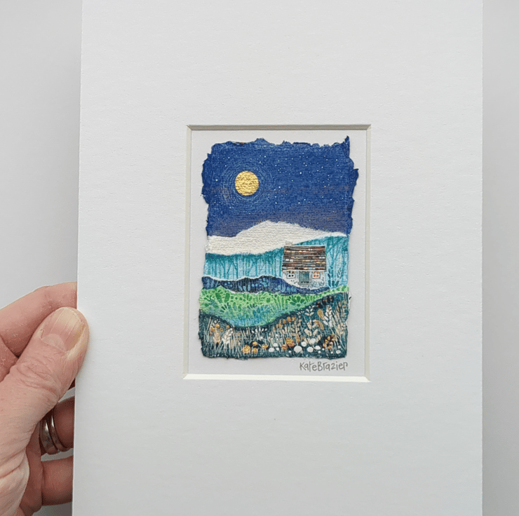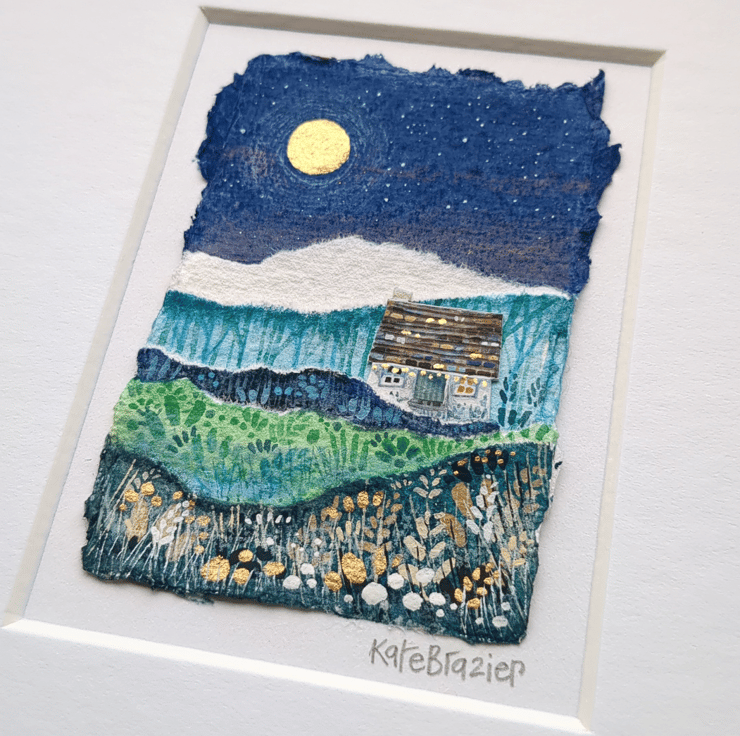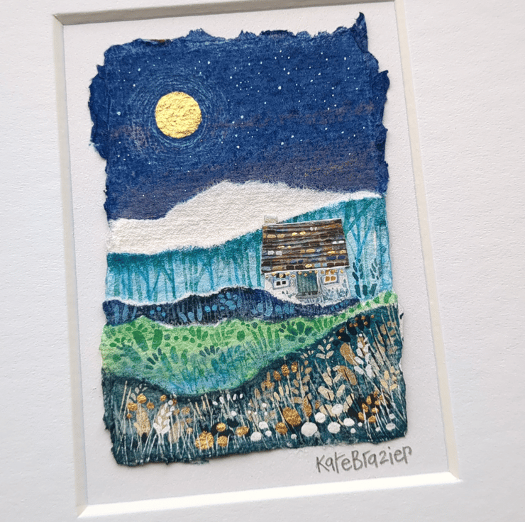 'Into the Woods Cottage' is a tiny, mixed media collage float mounted into a custom A5 mount. It has been finished with gold details.