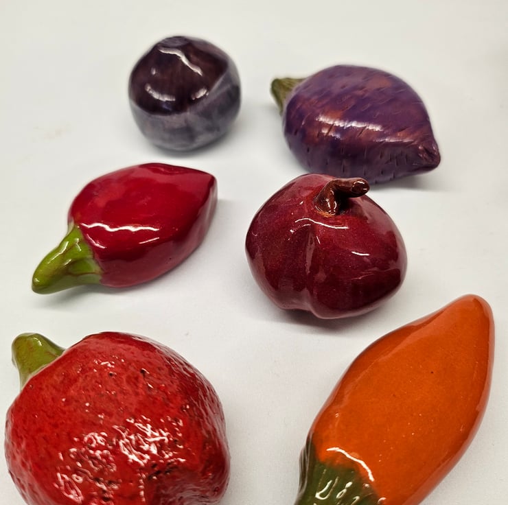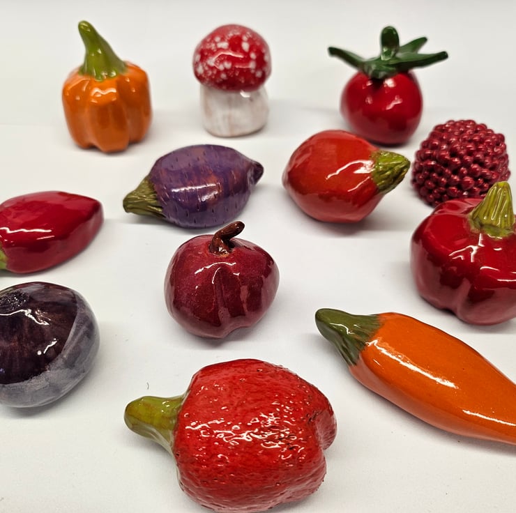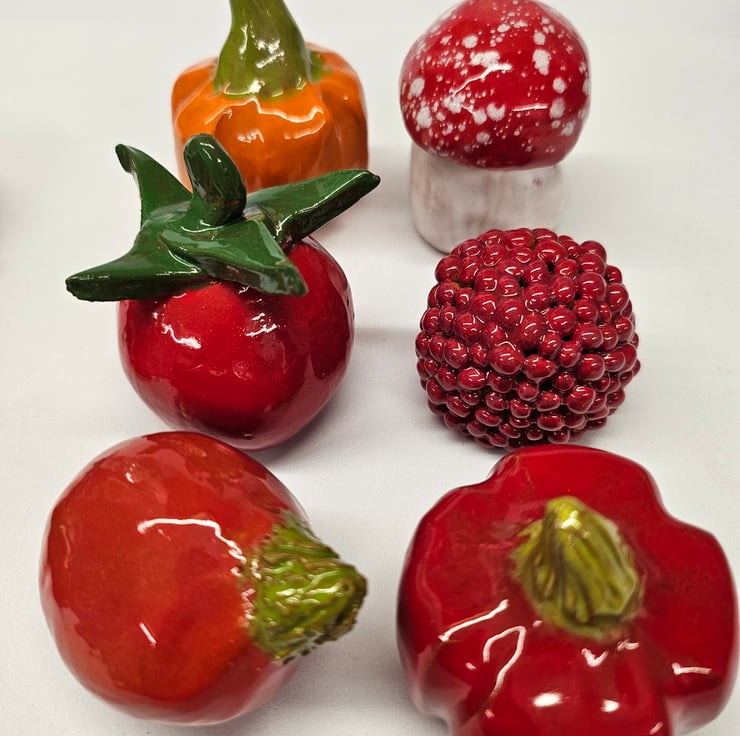 Cane Tops for your garden. Made from red earthenware clay, all glazed to suit the subject! Last for years and years in all weathers in your garden. This Vegetable Collection consists of Orange Bell Pepper, Mushroom, Tomato, Raspberry, Radish, Beetroot, Red Bell Pepper, Red Pepper, Cherry, Carrot, Strawberry & a Turnip. I use a variety of different bamboo canes to give a variety of hole sizes to fit bamboo canes.