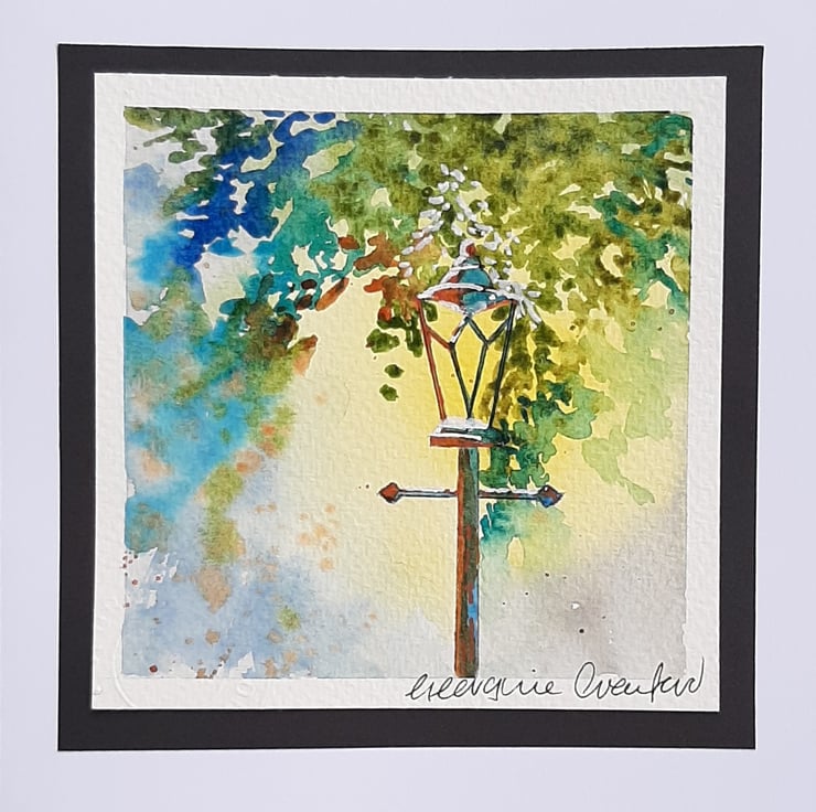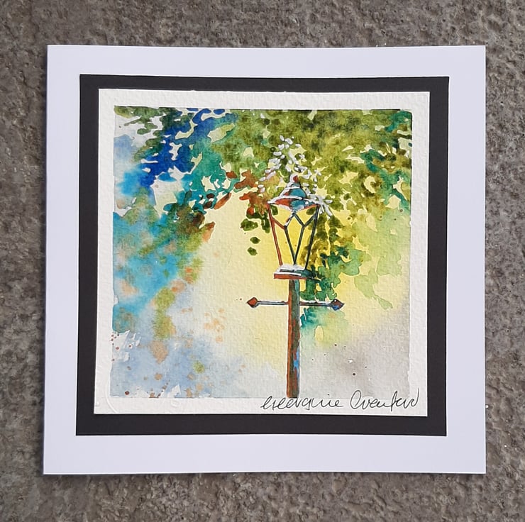 Painted on quality watercolour paper, mounted onto black paper then soft-white, hand cut card. Signed by the artist.