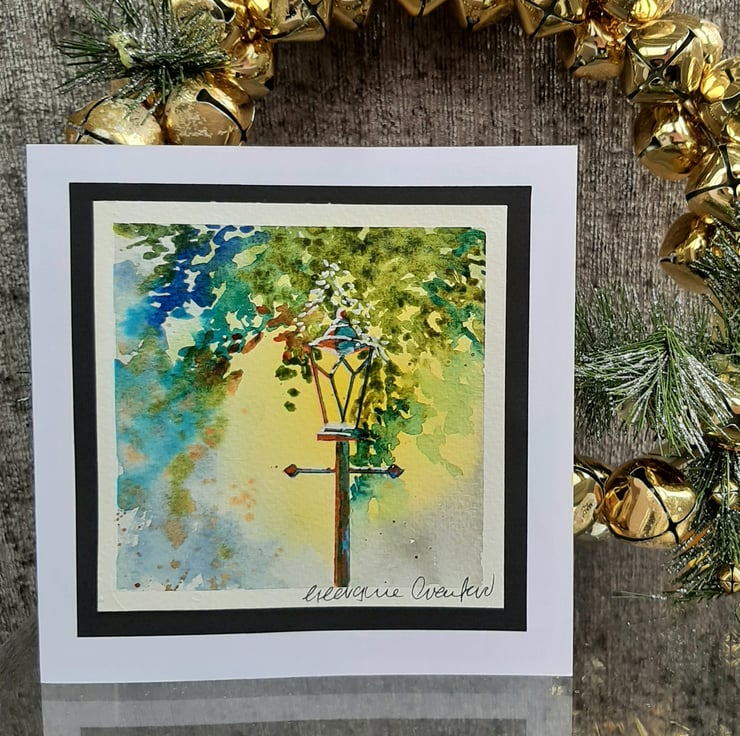 Beautiful handpainted mixed media Christmas card of a standing lantern with warm glow and shadows.