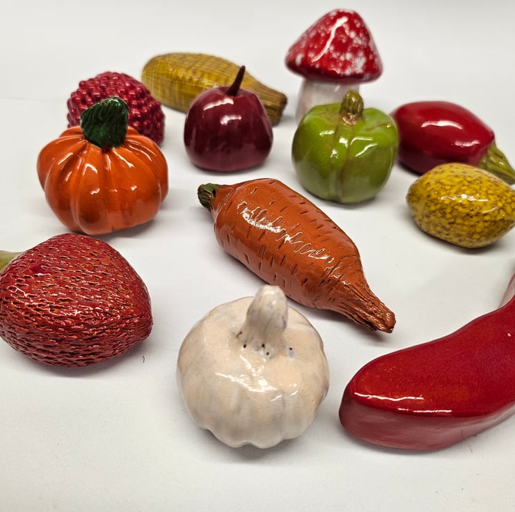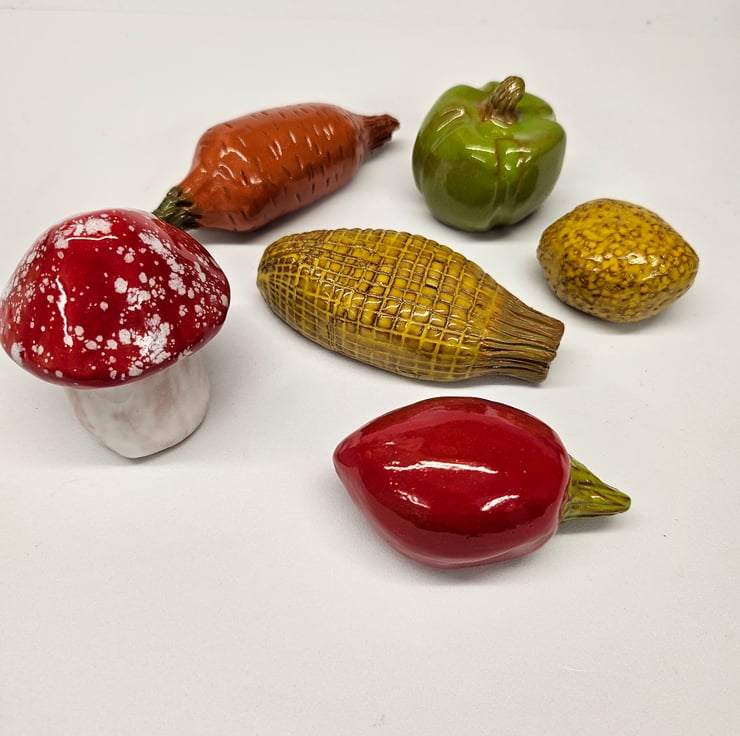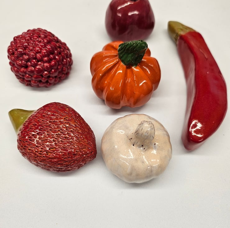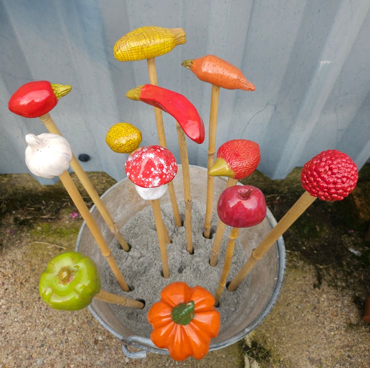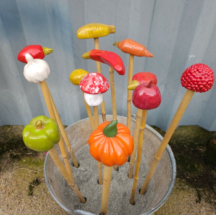 Cane Tops for your garden. Made from red earthenware clay, all glazed to suit the subject! Last for years and years in all weathers in your garden. This is the Vegetable Collection which consists of Strawberry, Jalapeno Pepper, Carrot, Lemon, Red Pepper, Green Bell Pepper, Cherry, Raspberry, Corn on the Cob, Mushroom, Garlic and a Pumpkin. I use a variety of different bamboo canes to give a variety of hole sizes to fit bamboo canes.