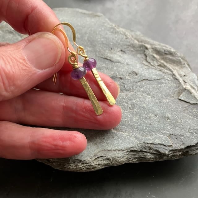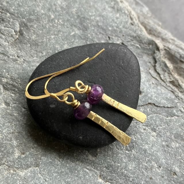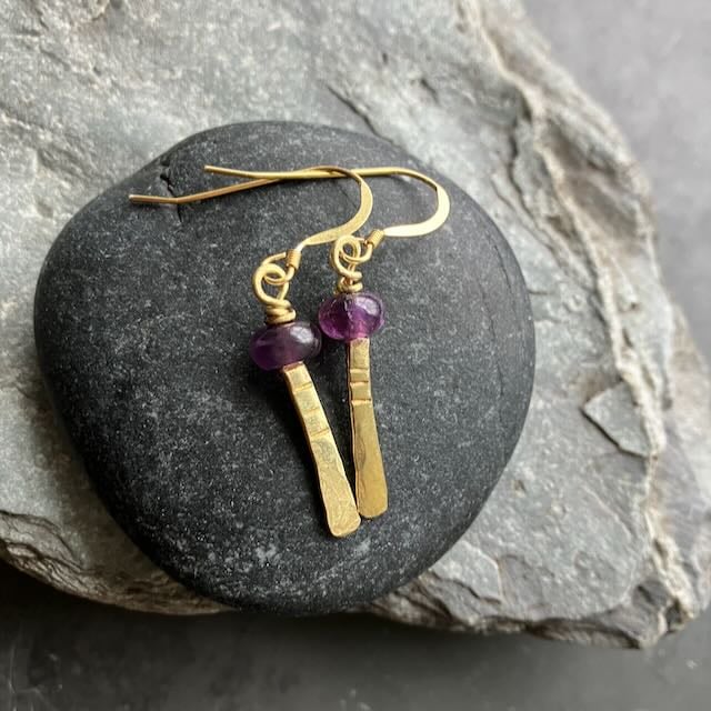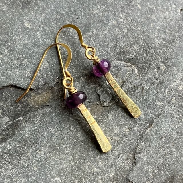 These sweet little drop earrings have a beaten brass tail topped with a dark purple amethyst bead . I have put a simple incised pattern at the top of the drop. The ear wires are gold vermeil (gold covered sterling silver).