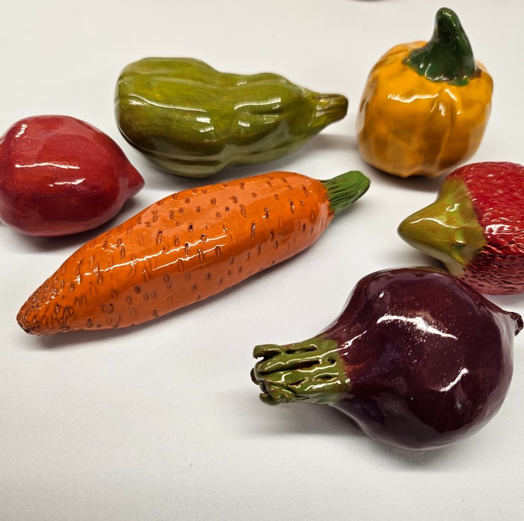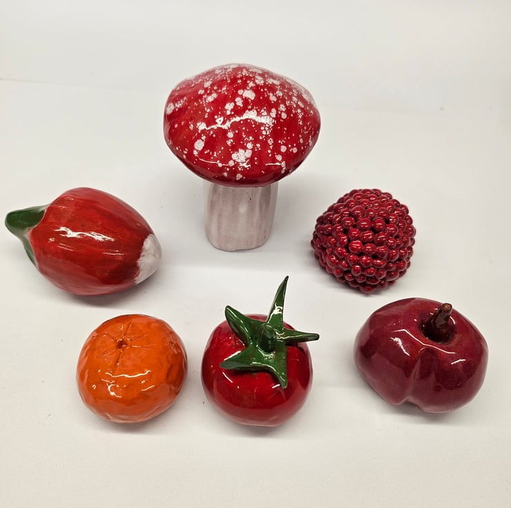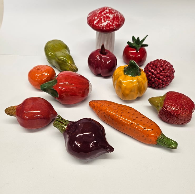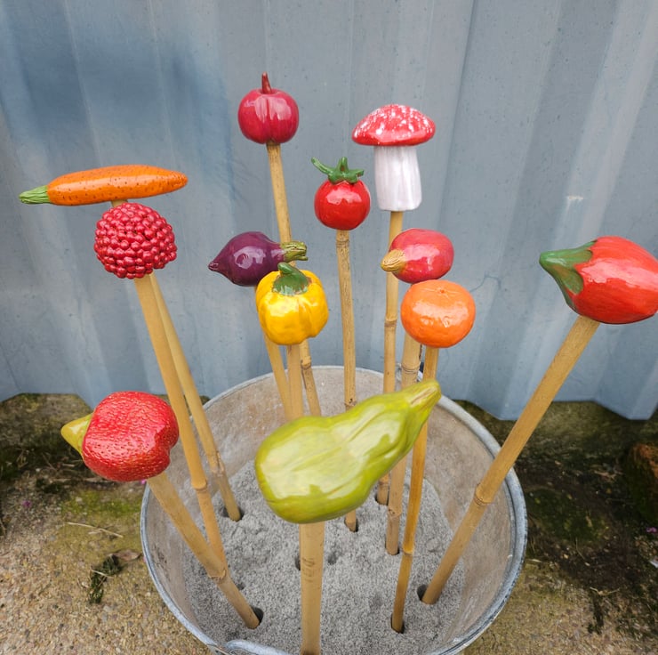 Cane Tops for your garden. Made from red earthenware clay, all glazed to suit the subject! Last for years and years in all weathers in your garden. This Vegetable Collection consists of a Squash, Mushroom, Cherry, Tomato, Raspberry, Yellow Bell Pepper, Strawberry, Carrot, Beetroot, Radish, Orange and a Red Pepper. I use a variety of different bamboo canes to give a variety of hole sizes to fit bamboo canes.