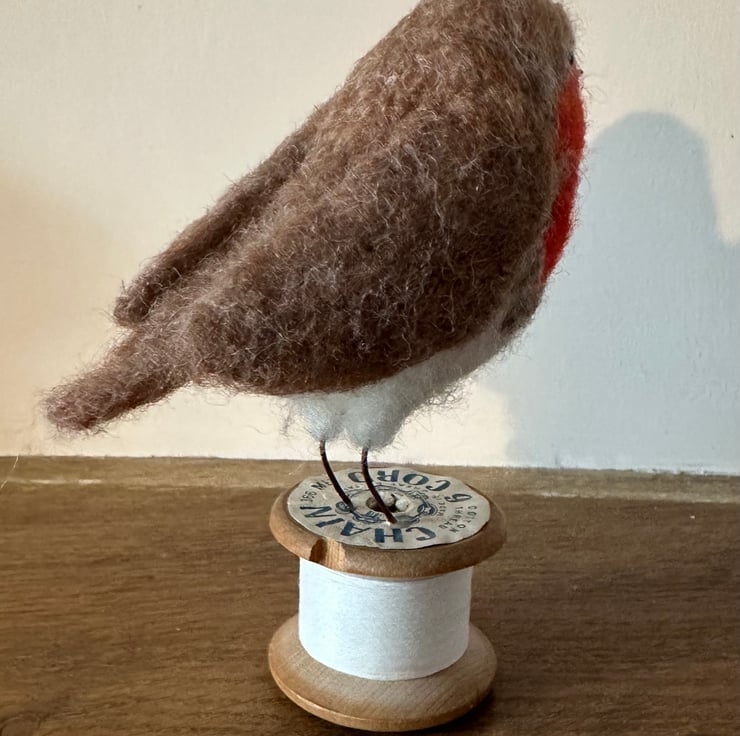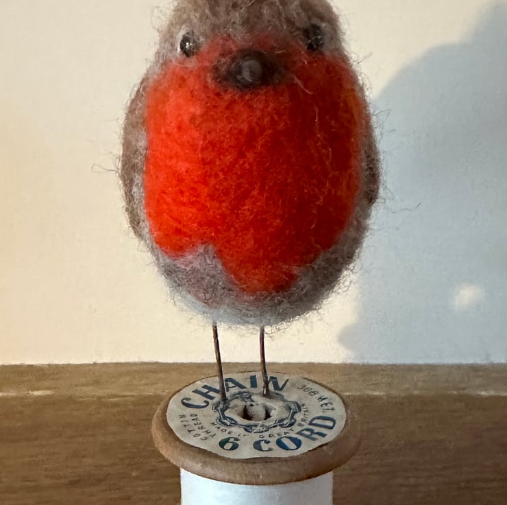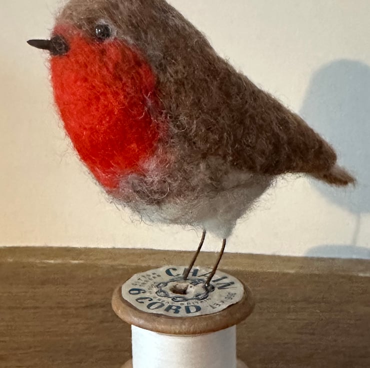 Needle felted wool with wire legs,bead eyes , silk clay beak attached to a wooden bobbin