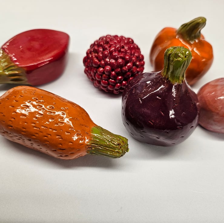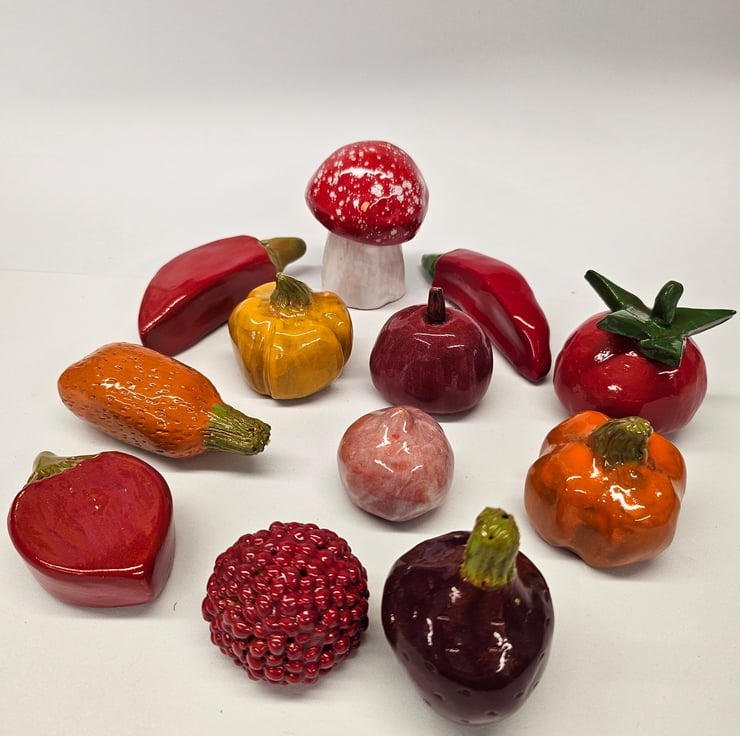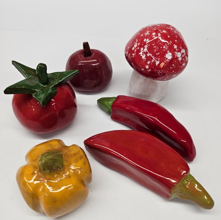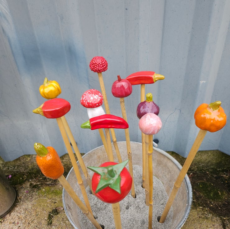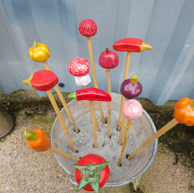 Cane Tops for your garden. Made from red earthenware clay, all glazed to suit the subject! Last for years and years in all weathers in your garden. This Vegetable Collection consists of a Mushroom, 2 Jalapeno Peppers, Carrot, Yellow Bell Pepper, Cherry, Tomato, Orange Bell Pepper, Garlic, Red Pepper, Raspberry and a Beetroot. I use a variety of different bamboo canes to give a variety of hole sizes to fit bamboo canes.