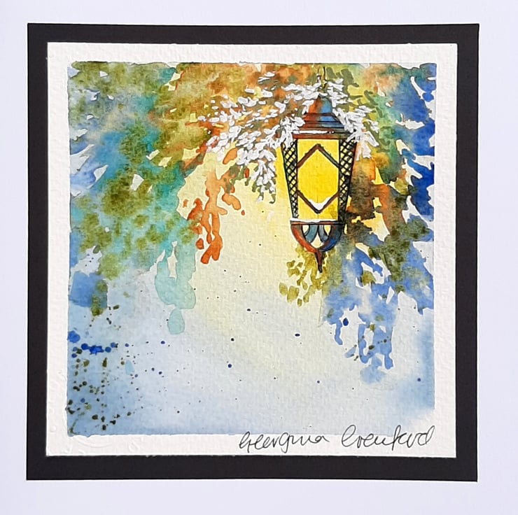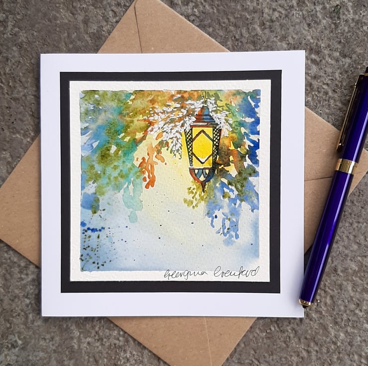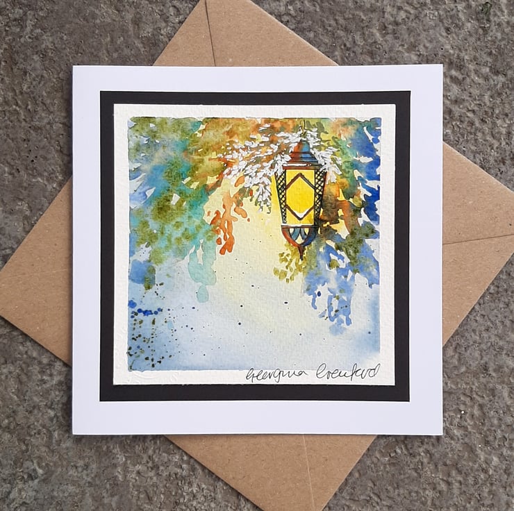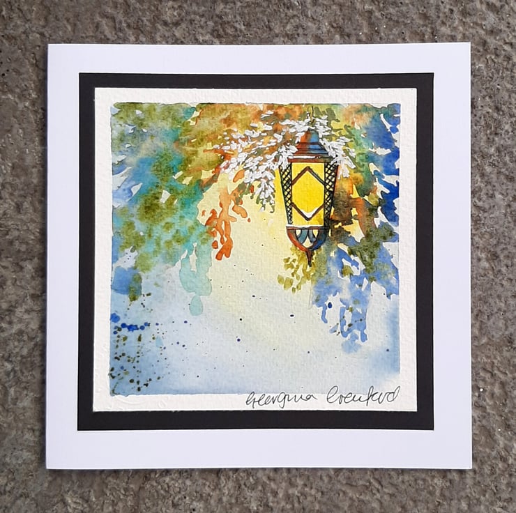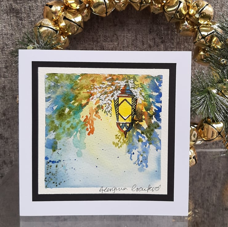 Beautiful handpainted mixed media Christmas card of a hanging lantern with warm glow and shadows.