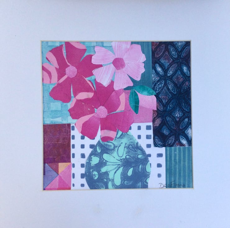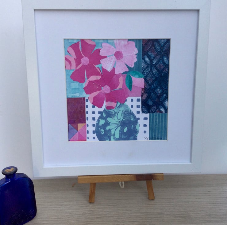 This is a small original collage, the image measuring 19cm x 19cm and is based on some birthday flowers. I decided not to paint a background in this instance and just select the printed papers to use from a vast collection. These were then assembled to form a semi-abstract image and fixed to mountboard. It has a white mount and plain white simple frame. The framed size is 33cm x 33cm.