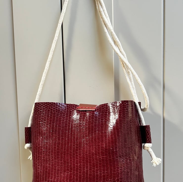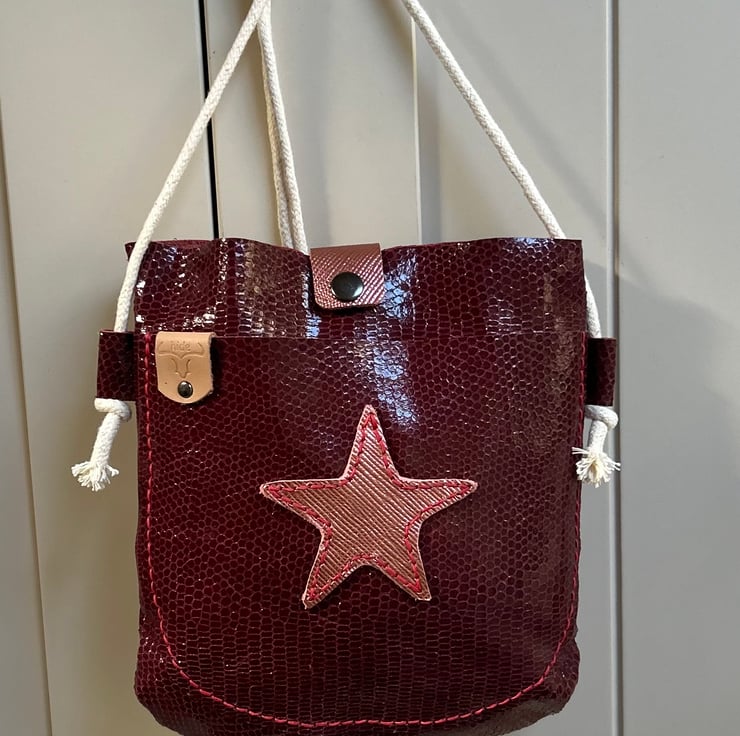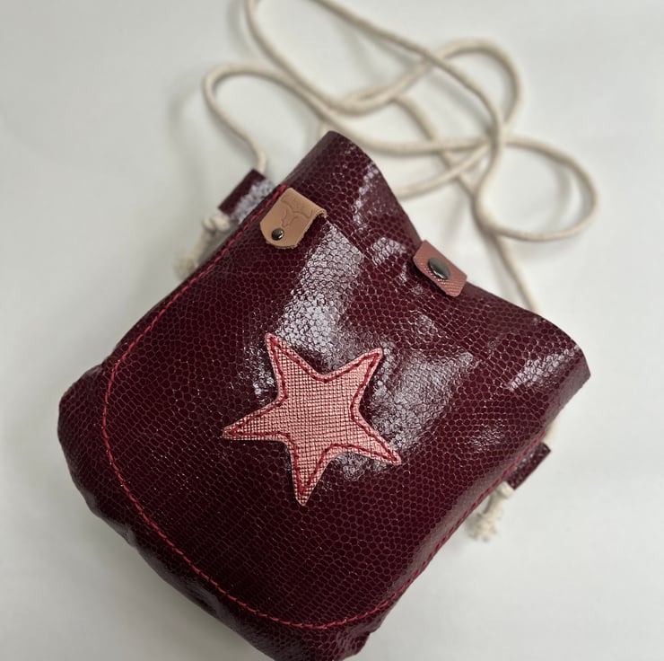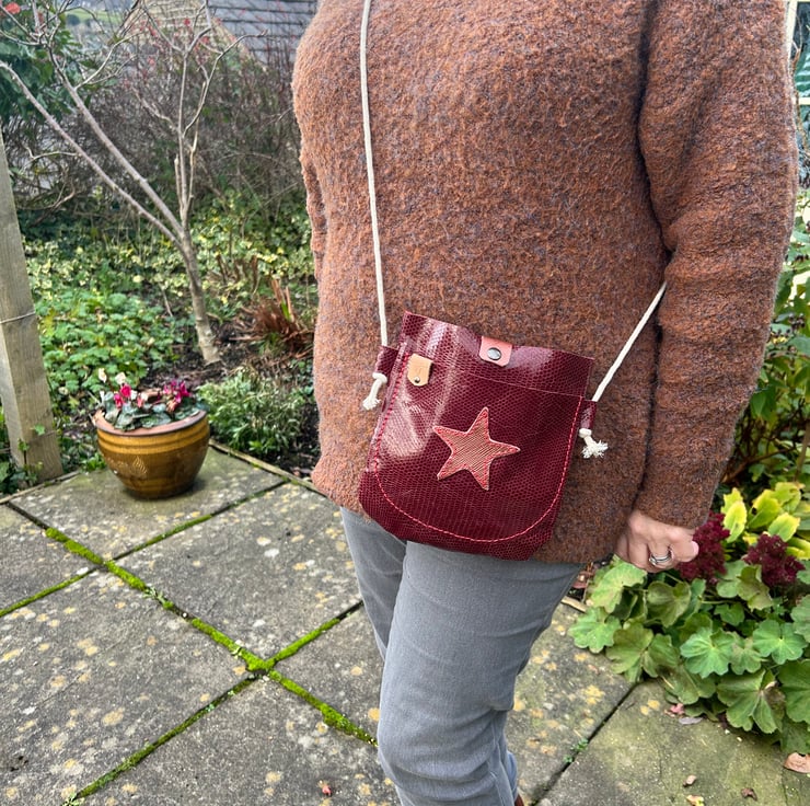 Crossbody bag in burgundy leather snakeskin with a handy outer pocket featuring a rose gold textured leather star motif and a press stud fastening keeping everything safe.