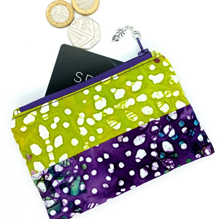 This lovely coin purse measures 13x9cm and is wadded and fully lined in purple spotted cotton to match the zip colour.