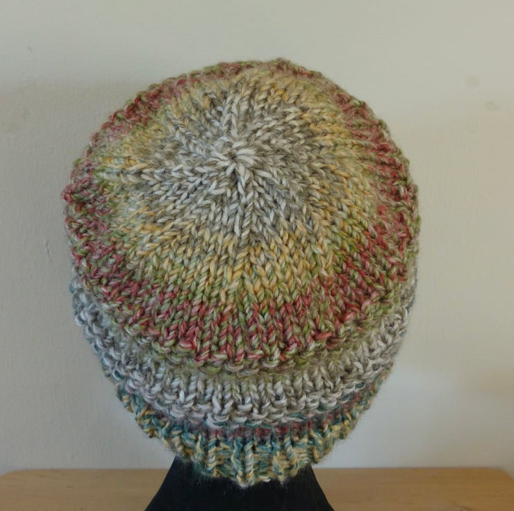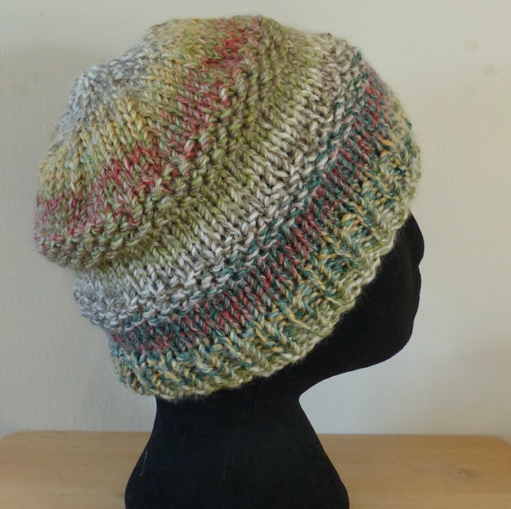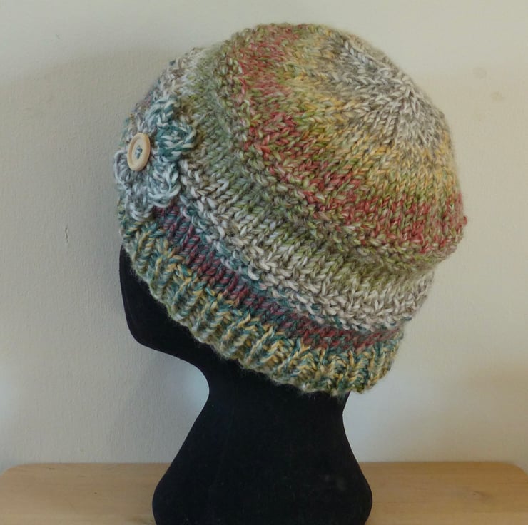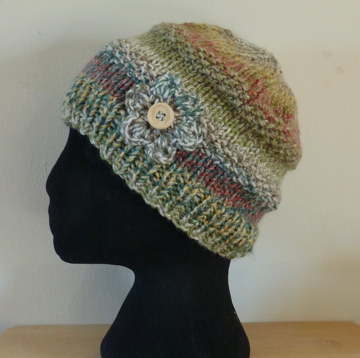 A hand knitted Beanie Hat in a chunky variegated yarn in country colours - greens, beige, orange etc. It has a crocheted flower in the same yarn at the hat stitched just above the rib for decoration. This flower has a natural wood button in the centre.