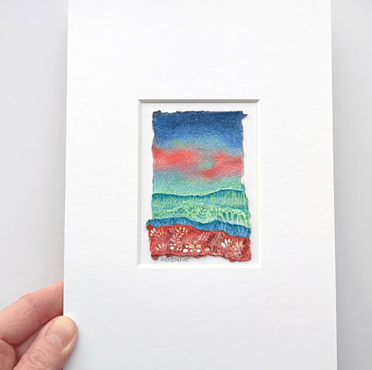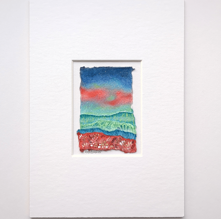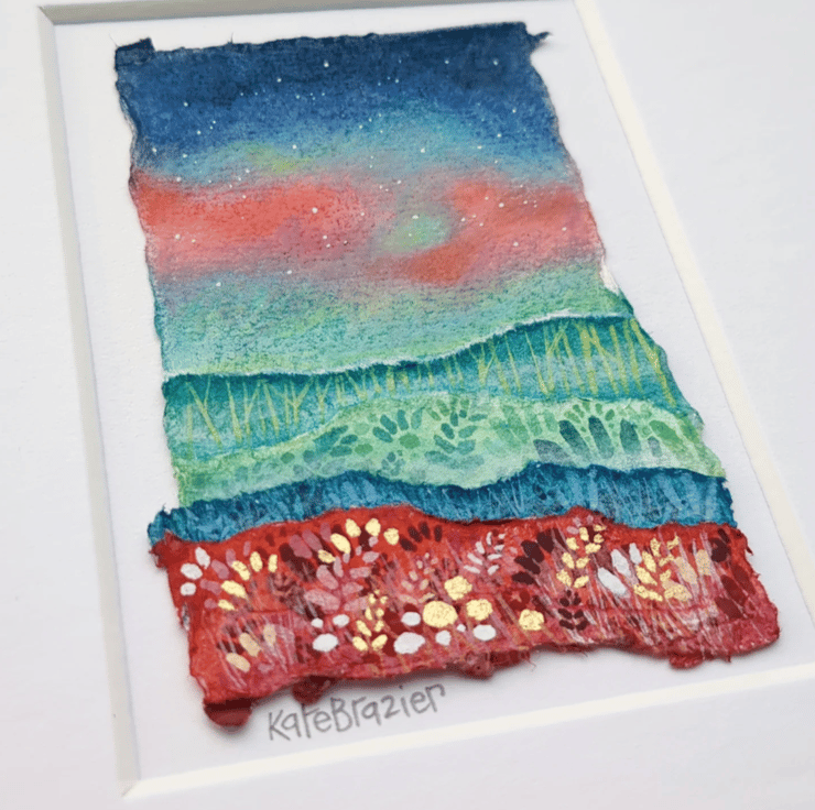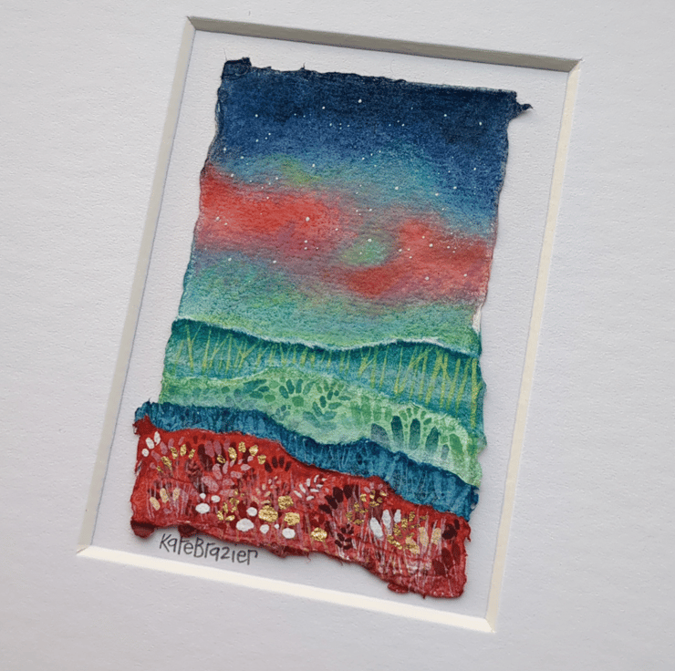 'Aurora Skies' is a tiny, mixed media collage float mounted into a custom A5 mount. It has been finished with gold details.