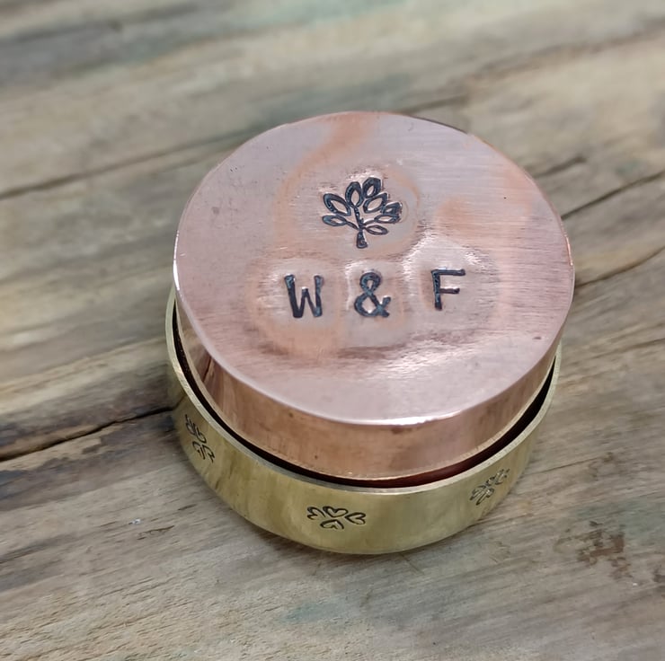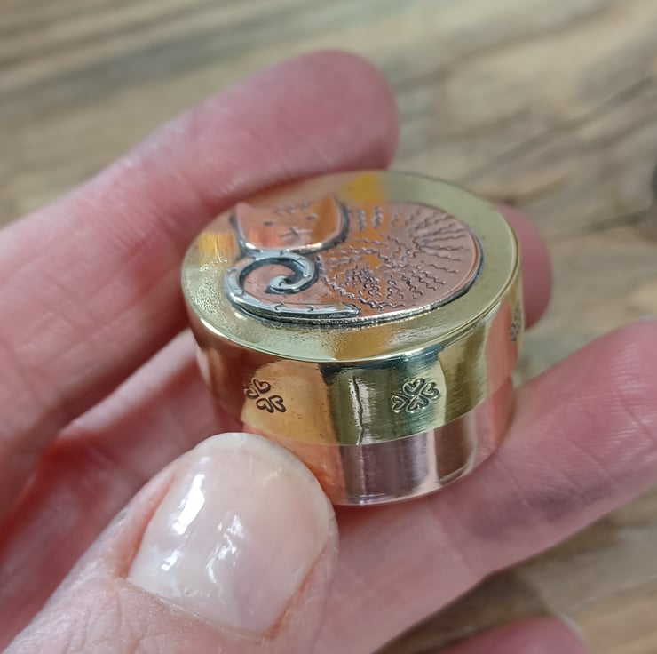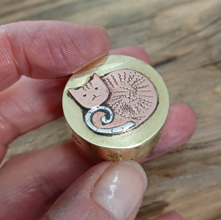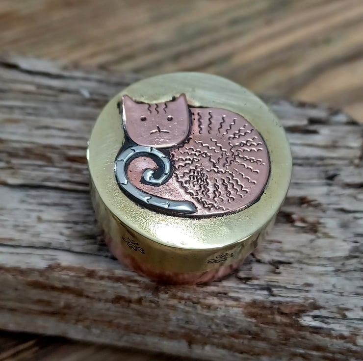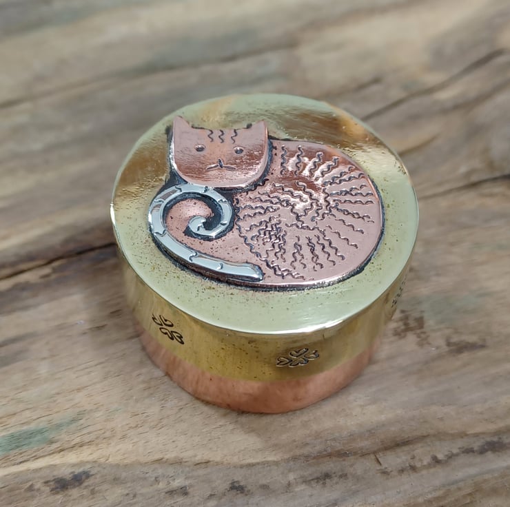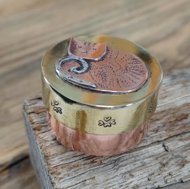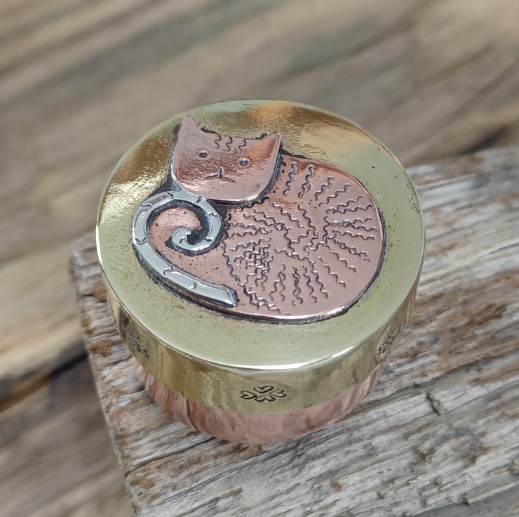 Made from copper, brass and silver sheet . This delightful mini box could be a place to store any little keepsakes or just as a collectable. It has been hand sawn, soldered ,filed , sanded and polished. A cute little cat has been added to the lid using metal punches and soldering techniques, he sports a fine curly silver tale!