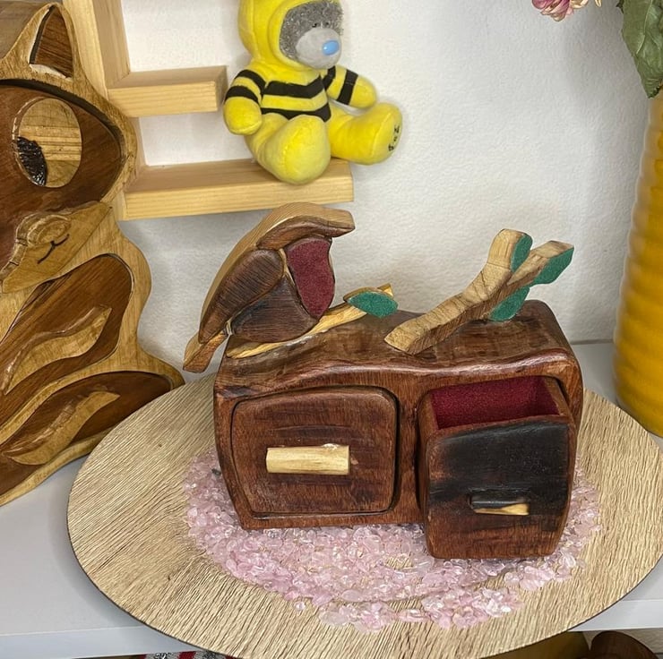 Every detail is designed to evoke the tranquility of nature: the delicate branch design and the vibrant red and green velvet-lined drawers, reflecting the warm tones of the robin and the surrounding environment. Measuring 20 cm x 15 cm x 10 cm, this box is perfect for storing small treasures or as a decorative piece to enrich any room in your home.