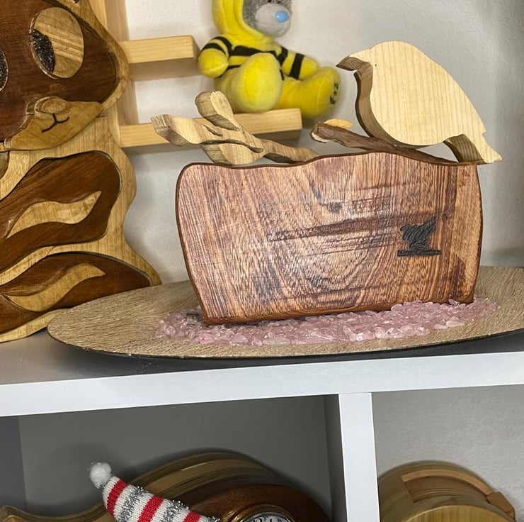 Discover the perfect blend of nature and craftsmanship with this extraordinary bandsaw box, handcrafted from African sapele wood. A finely carved robin seems to gently rest on a branch sculpture, with the natural beauty of the wood enhanced through the technique of pyrography, which highlights the unique grain and texture.