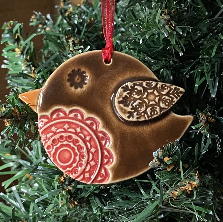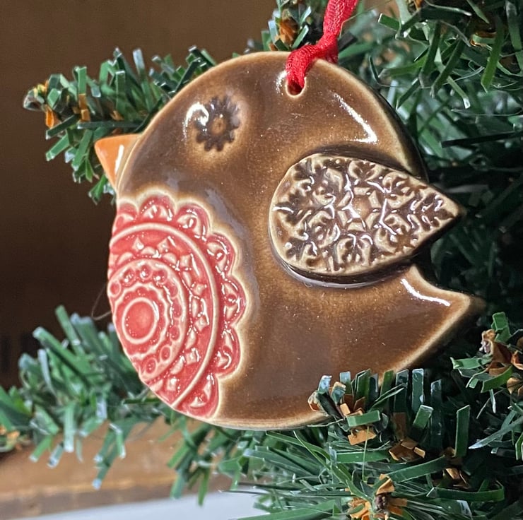 Please note this robin is reduced because it has a lot of glaze filling in the pattern of his eye. This cute little robin is made from white earthenware clay and decorated with pattern. It has been fired twice and finished with rich, glossy glazes. Glazed on the front only. It measures 8cm x 6cm x 0.7cm deep and hangs from a matching organza ribbon.