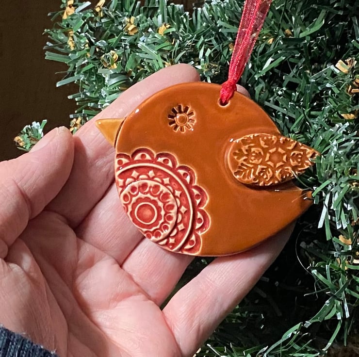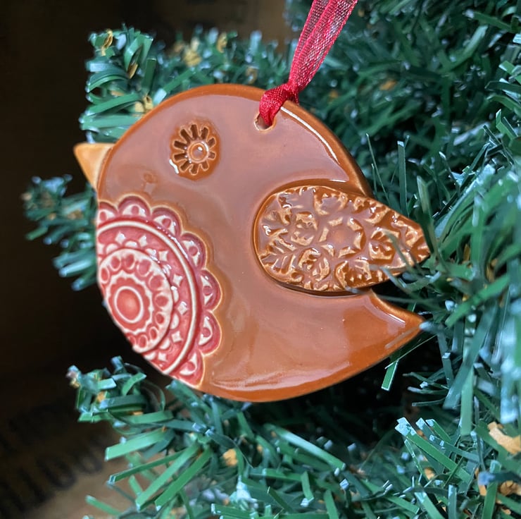 Please note this robin is reduced because the brown glaze is a bit too red. This cute little robin is made from white earthenware clay and decorated with pattern. It has been fired twice and finished with rich, glossy glazes. Glazed on the front only. It measures 8cm x 6cm x 0.7cm deep and hangs from a matching organza ribbon.