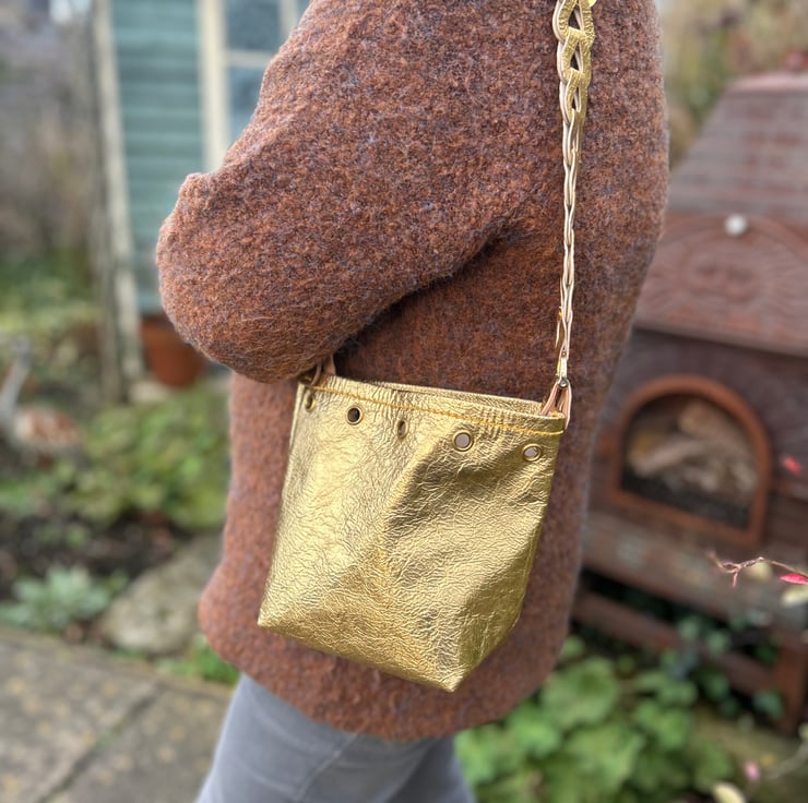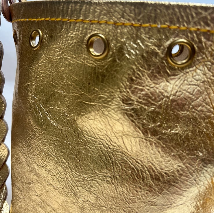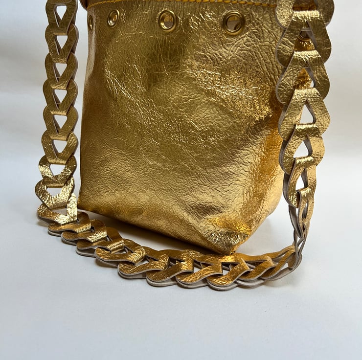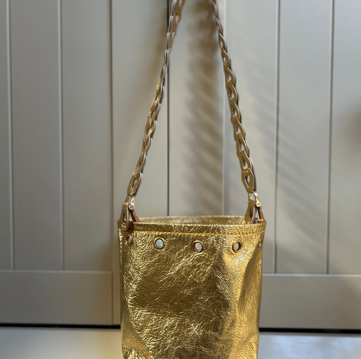 Gold leather bucket bag. An eye catching crinkle metallic gold leather bag with feature gold colour ring border and a chain link handle that can be hand held or worn over the shoulder, whichever way this statement piece will compliment any outfit and make a great addition to any wardrobe.