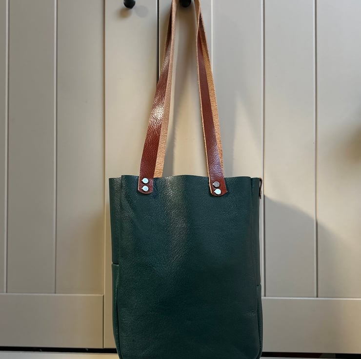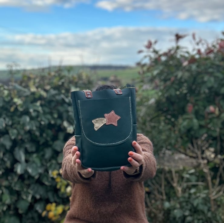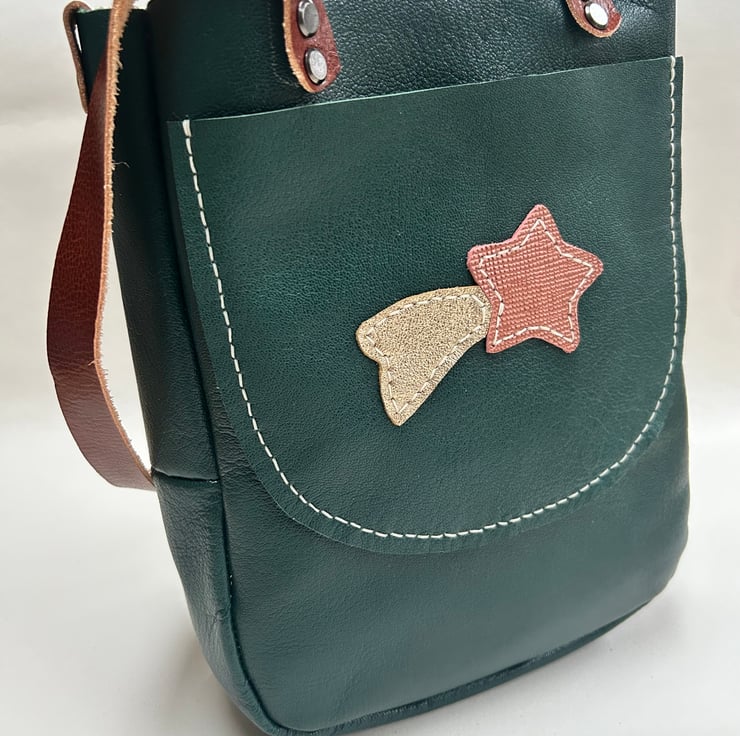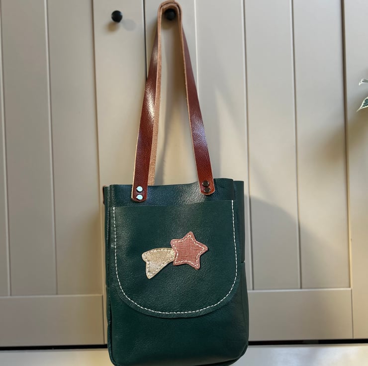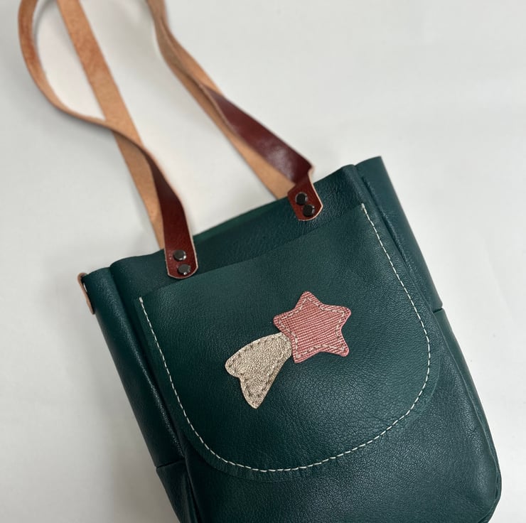 Leather tote bag in green with handy outer pocket and feature shooting star motif. The handles are made from brown leather and held to the bag with sturdy Chicago screws. Can be worn over the shoulder or hand held. This is smaller than my usual tote bags so can be used by younger adults too, it may be smaller but it’s roomy. Grace would be a perfect bag for everyday use.
