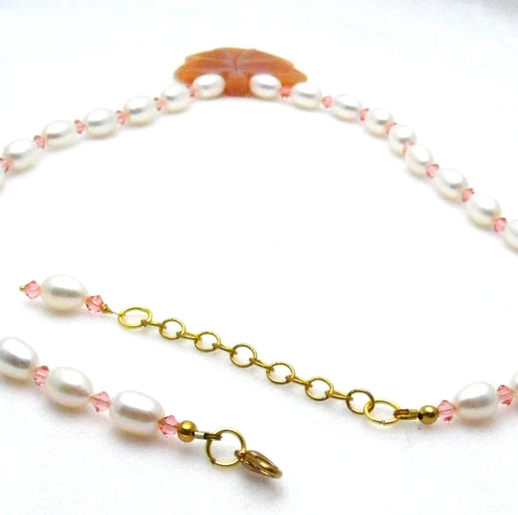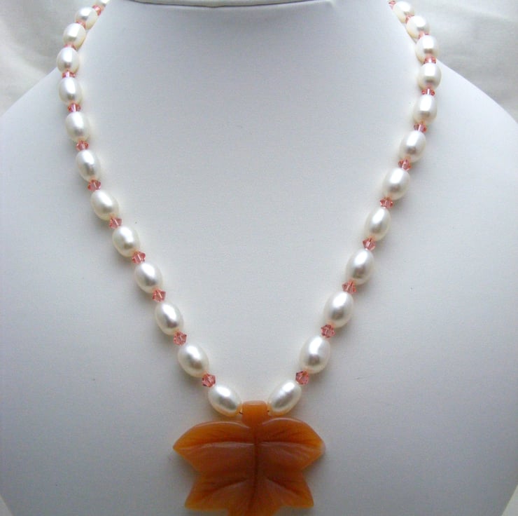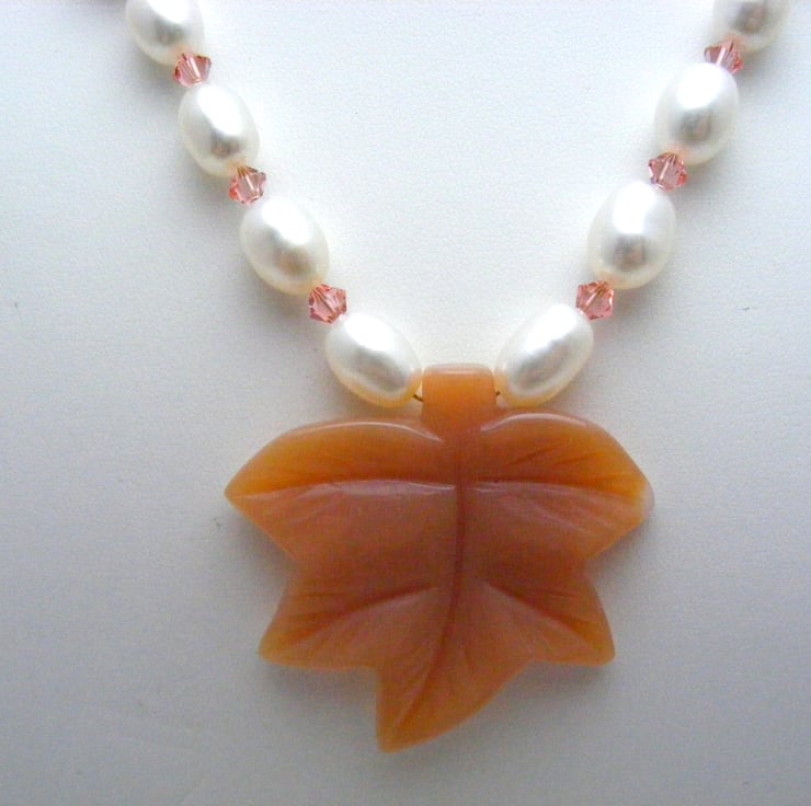 I've handmade this lovely necklace using a 43x41mm red agate carved leaf pendant, 9x8mm white freshwater pearls, 4mm rose peach Swarovski Crystals and gold plated findings. A beautiful necklace to finish off any outfit.