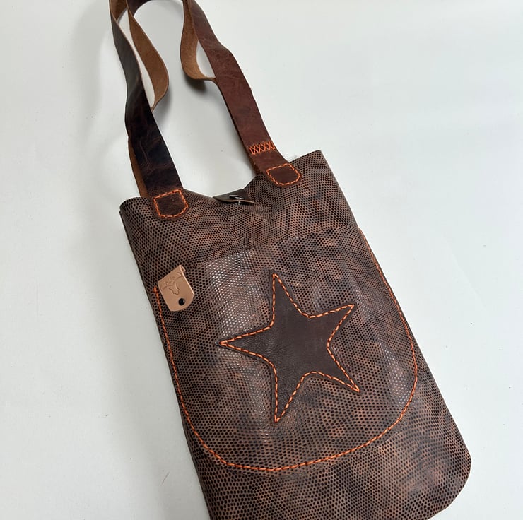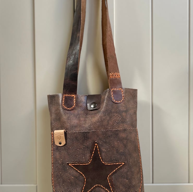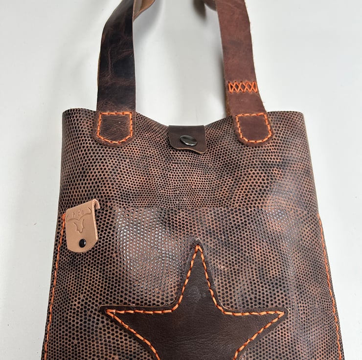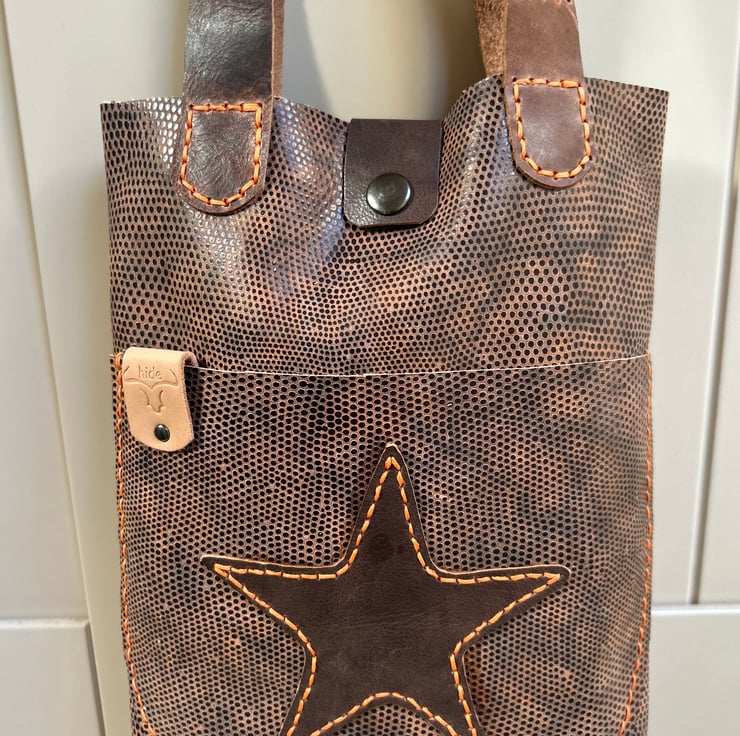 Leather tote bag in brown animal print with convenient outer pocket and brown leather star motif hand stitched with glossy orange waxed thread. Brown leather handles and a press stud fastener to keep everything safe.