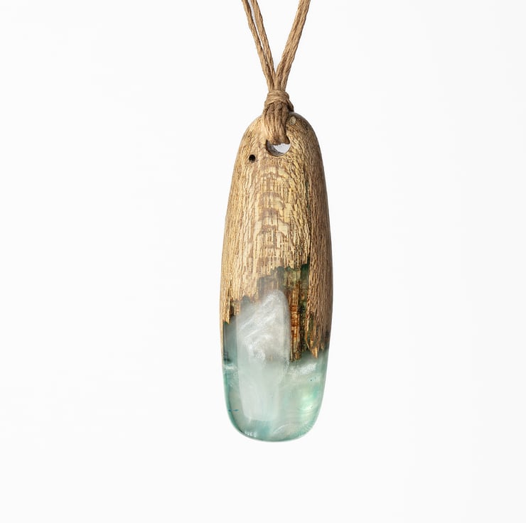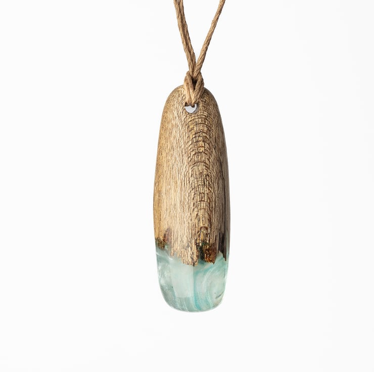 I made this pendant from a small piece of reclaimed iroko wood and hand poured resin. There is a richness and intensity to the grain of the hardwood and the blue-green and frost white pigments swirl in the resin to create a dramatic effect.