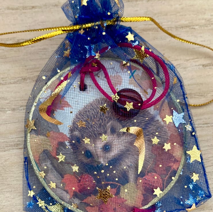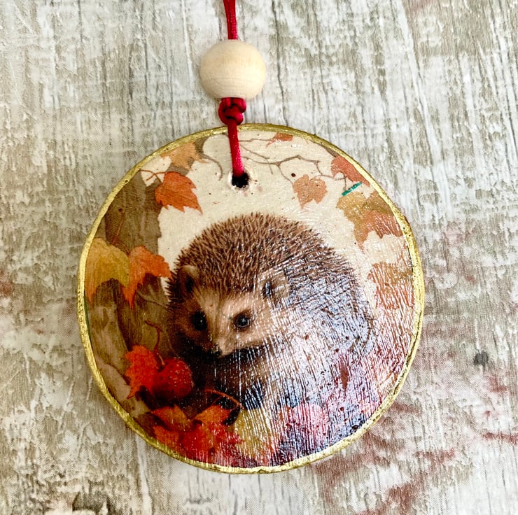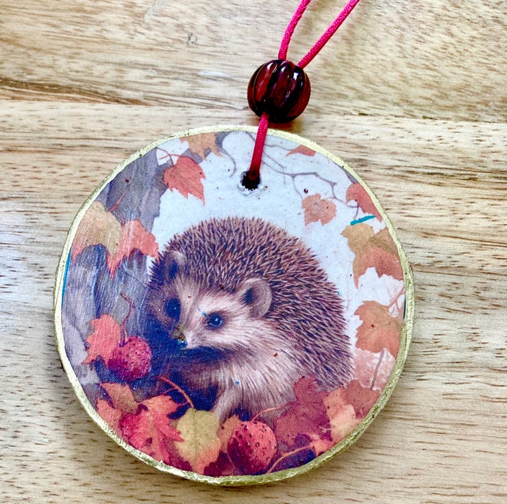 This has been decoupaged and thand painted hen given a gold edging, a light coat of varnish and a red cord with wooden bead. (Please note the images showing burgundy bead are the same hedgehog however I changed the bead to a natural wooden bead)