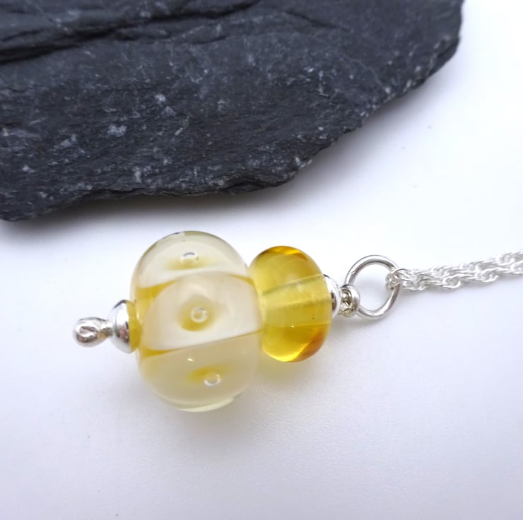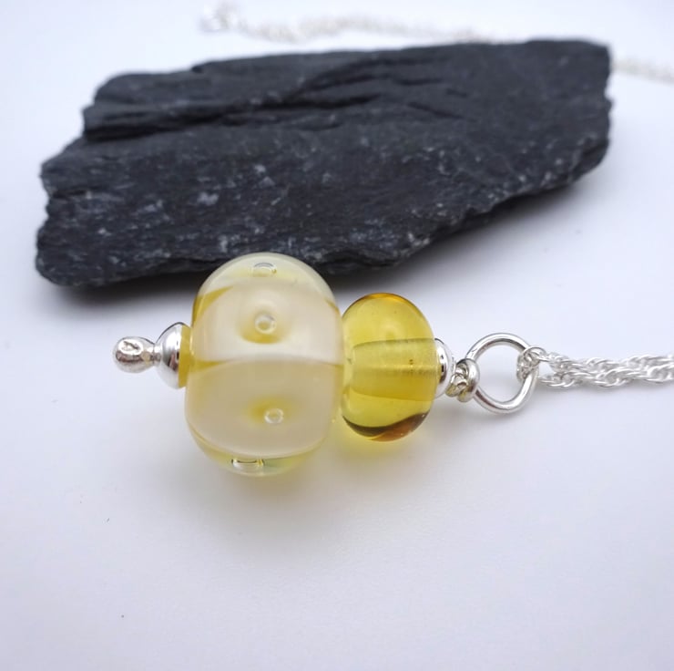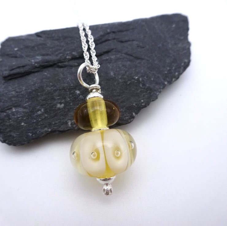 A sterling silver chain featuring a handmade lampwork glass pendant.