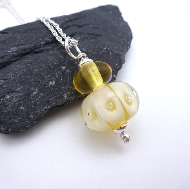 The glass pendant has been made with pale yellow glass with encased bubbles.