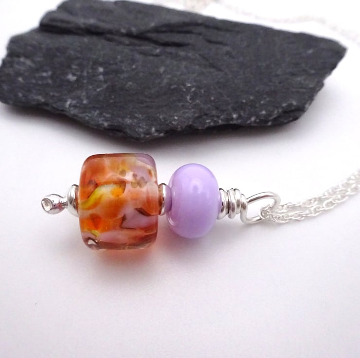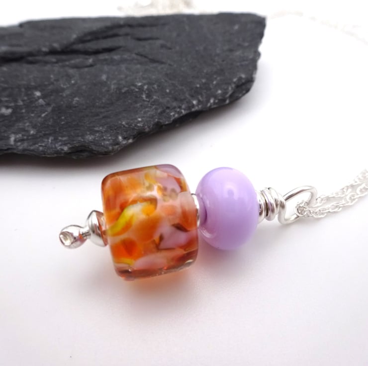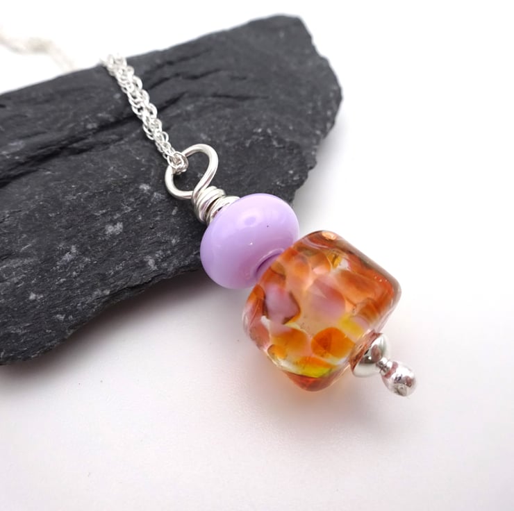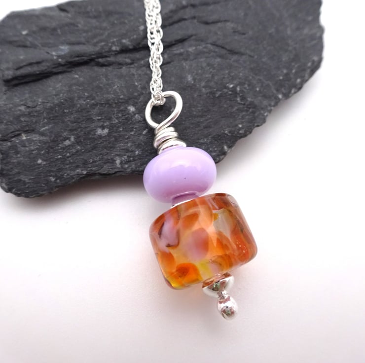 The glass pendant has been handmade by me using red orange and lilac glass.