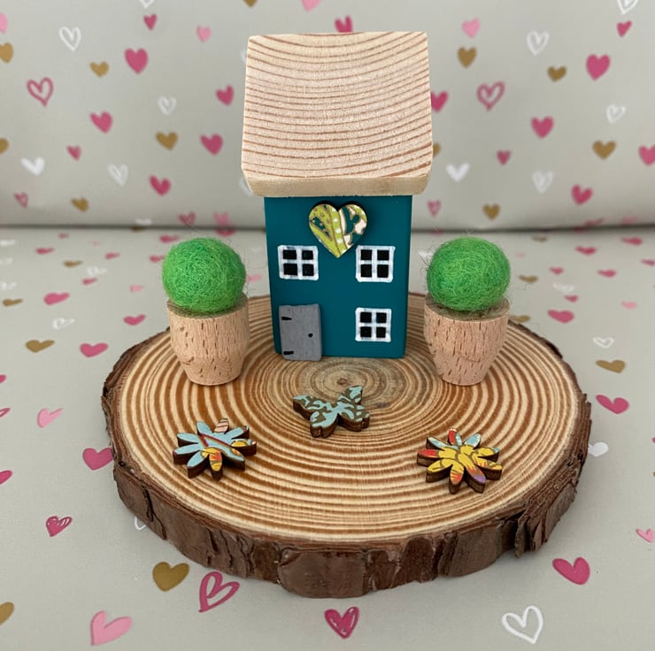 These whimsical handmade and hand painted miniature cottages come in a variety of colours and are mounted on a rustic, natural wooden circle. The base measures approximately 8-10cms and the height is approximately 7cms.