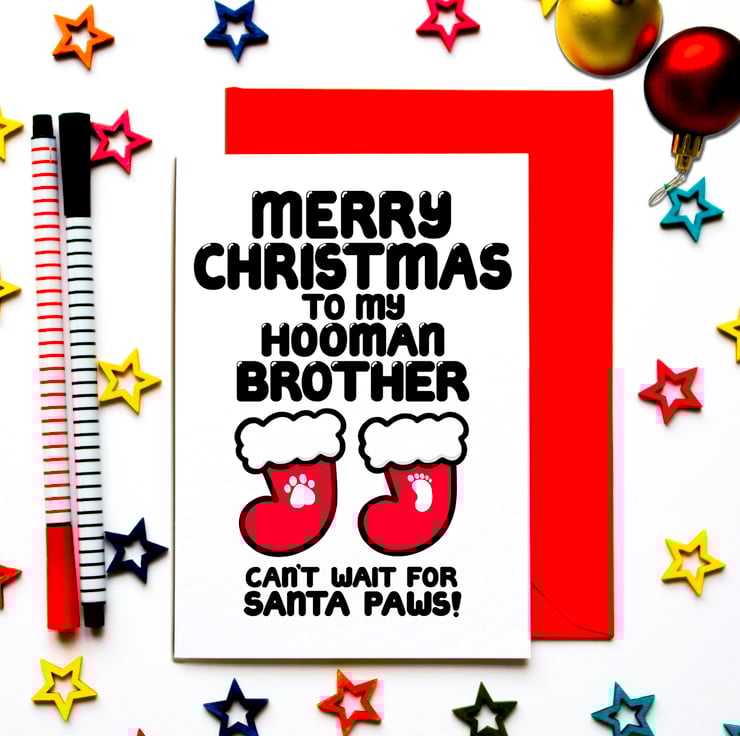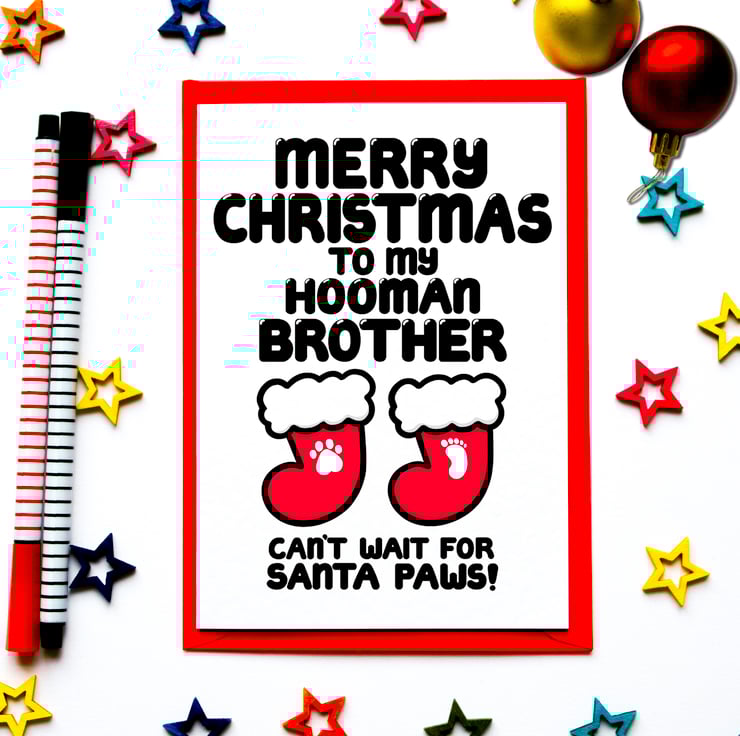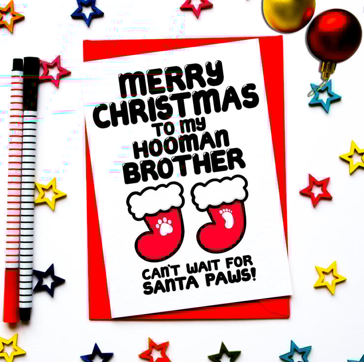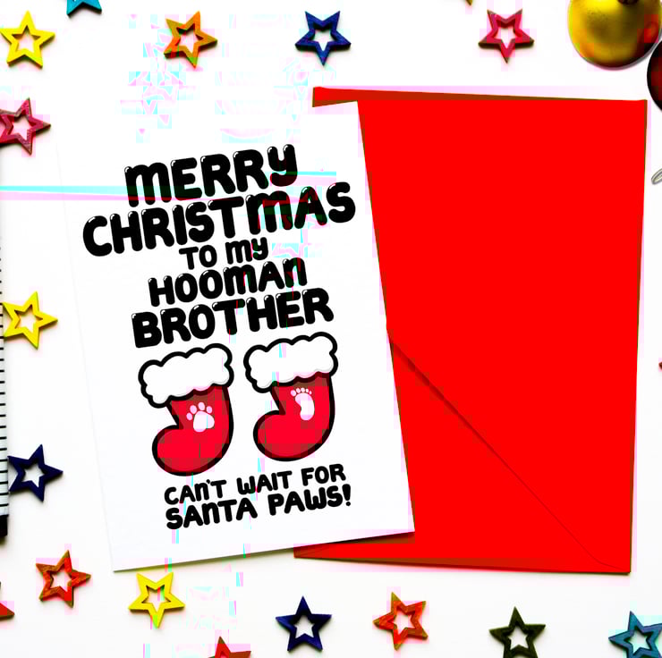 Let your furry friend spread some holiday cheer with this hilarious Christmas card from your dog or cat to their favourite human sibling! This adorable Christmas card is the perfect way to wish your brother a tail-wagging holiday season. Whether you're looking for a funny greeting from your dog, cat, or any furry family member, this card will surely bring a smile. The inside leaves plenty of room for you to add a personal touch or let your pet "sign" their name with a paw print (if they're able to hold