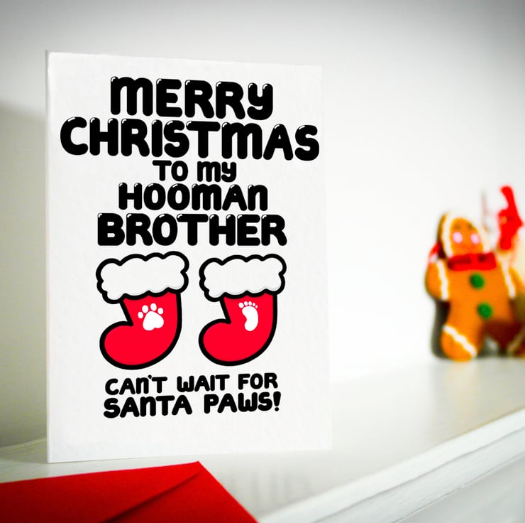 Greeting on front: MERRY CHRISTMAS TO MY HOOMAN BROTHER PLEASE TELL SANTA PAWS I'VE BEEN PAWSITIVELY NICE