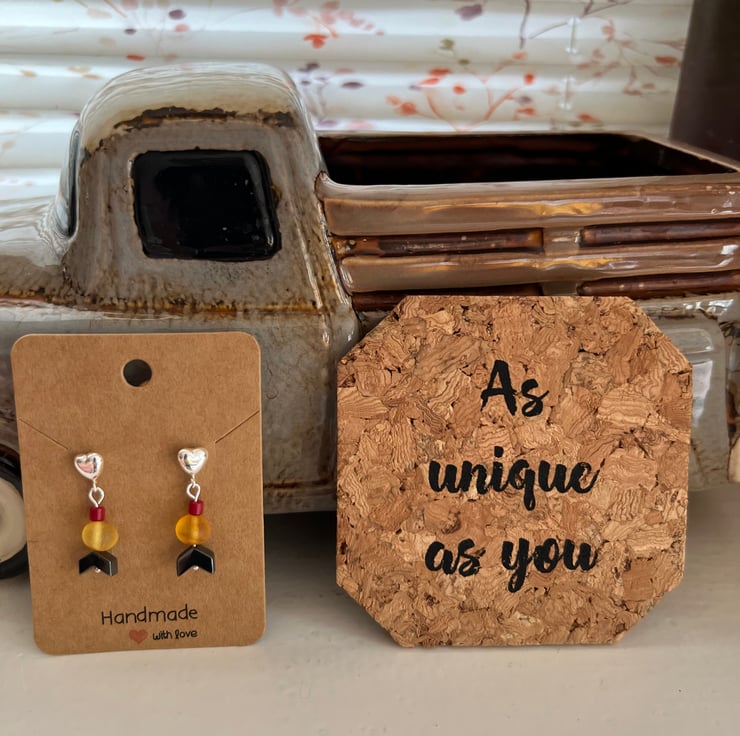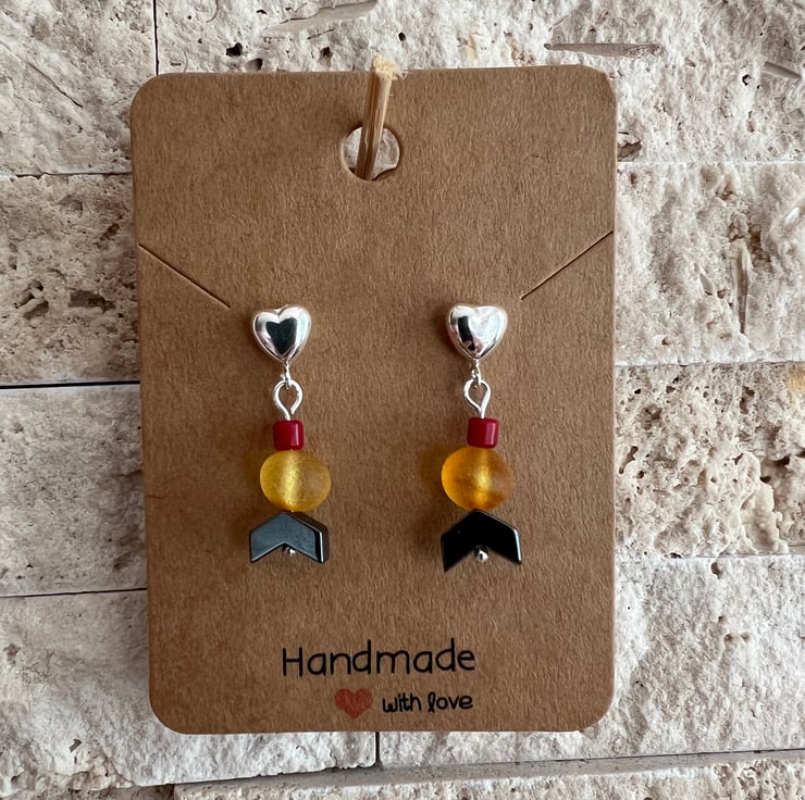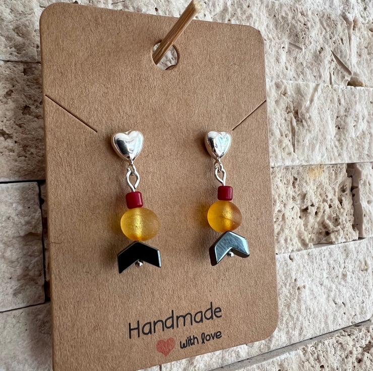These heart shaped sterling silver drop stud earrings ,feature beautiful combination of genuine Baltic amber, hematite and coral.