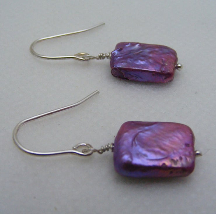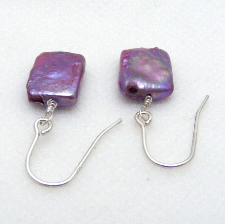 Earrings are handmade with, 13x11mm purple freshwater rectangle pearls, headpins and 925 stamped sterling silver ear wires.